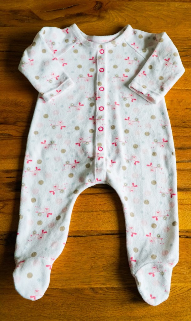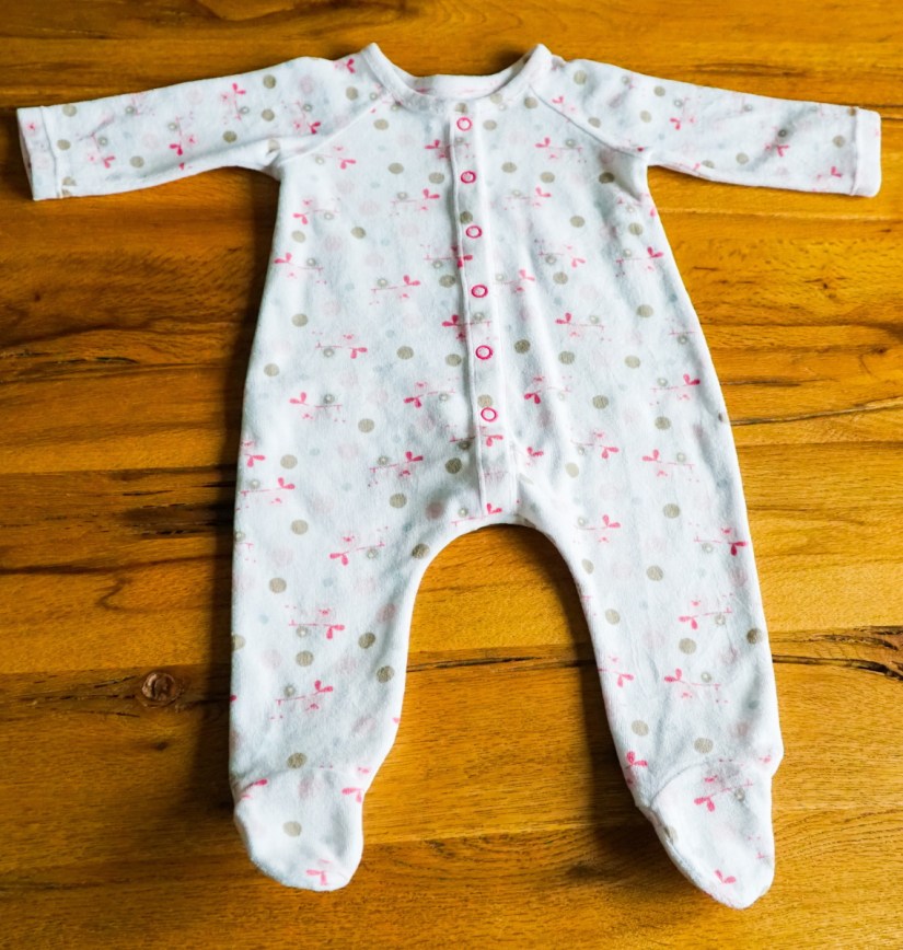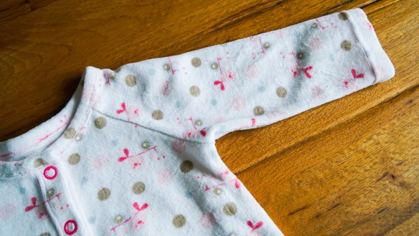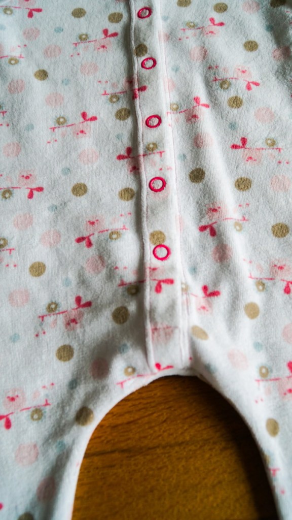 Le patron propose de terminer le devant avec des boutonnières et des boutons cousus. Je décide de les remplacer par des boutons pression, que je trouve beaucoup plus pratiques sur les vêtements pour bébés. Je les choisis en rose pour donner un peu de dynamisme aux couleurs tendres du tissu. L’ensemble est absolument adorable et super pratique pour les premières nuits fraîches de bébé. Ce ne sera sûrement pas ma dernière réalisation de ce modèle!