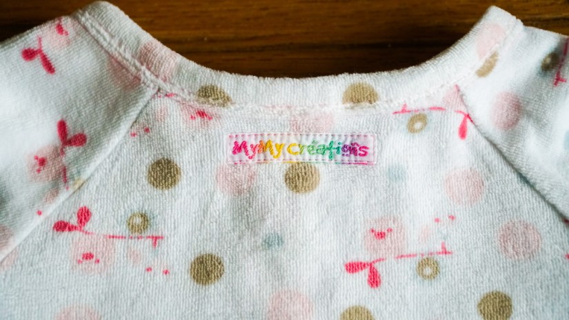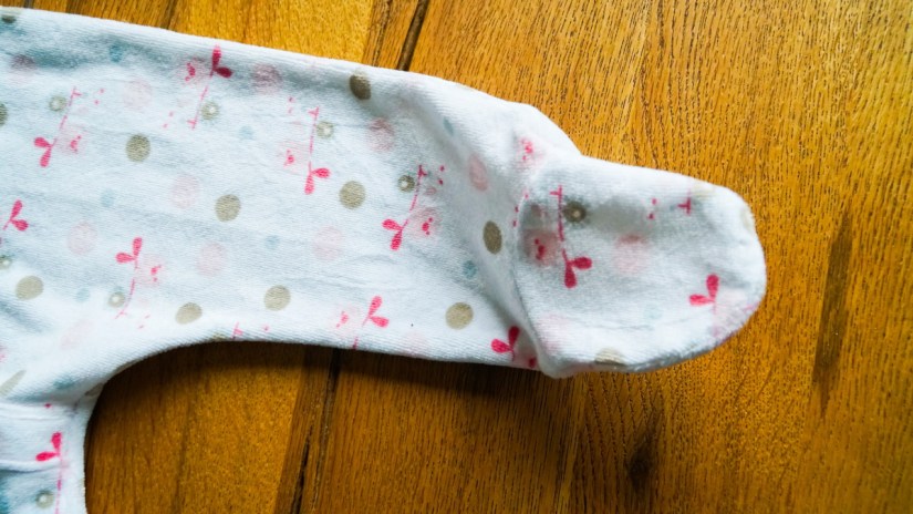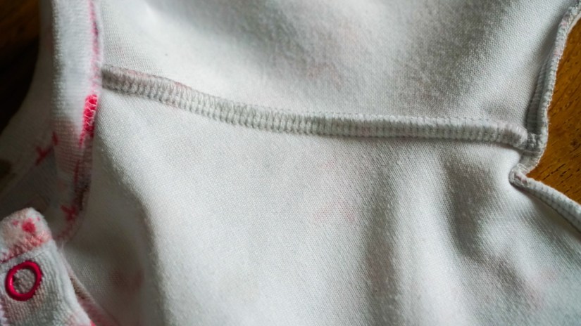 Le modèle est très simple à coudre, même si l’assemblage des petits pieds demande un peu de minutie. Je le couds entièrement avec ma nouvelle surjeteuse, sauf les surpiqûres à l’aiguille double sur le devant, l’encolure et les manches – que je réalise avec un fil rose assorti aux motifs.