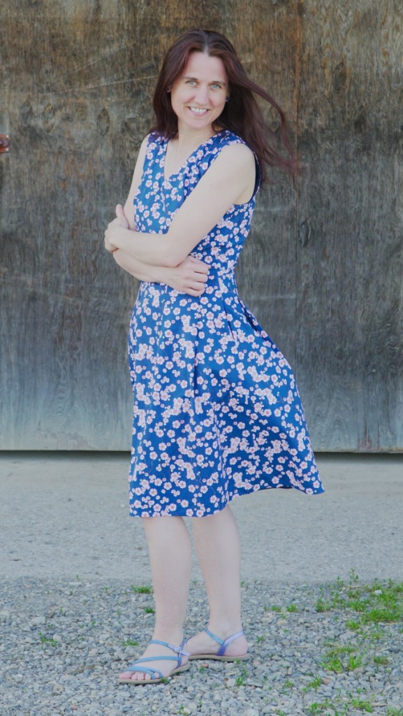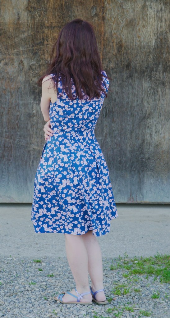 Le bleu profond du tissu ainsi que les délicates fleurs de cerisiers font de cette robe une création toute particulière. On peut la porter avec des chaussures à talons ou des sandales plates, en fonction de l’effet souhaité. Pour le photo-shooting dans les champs près de chez nous, les sandales s’imposaient!
