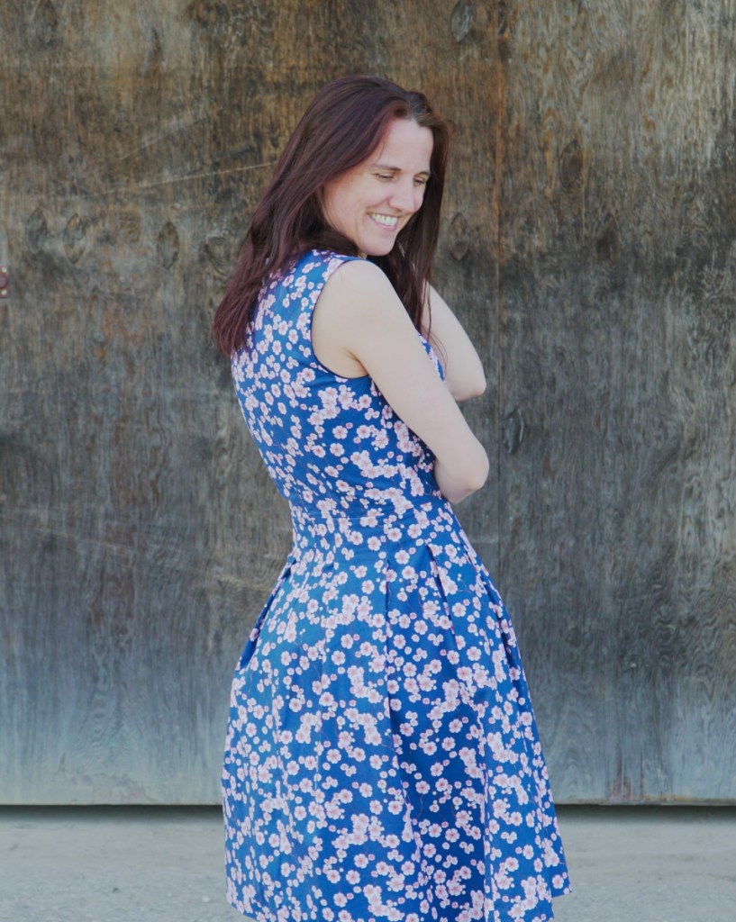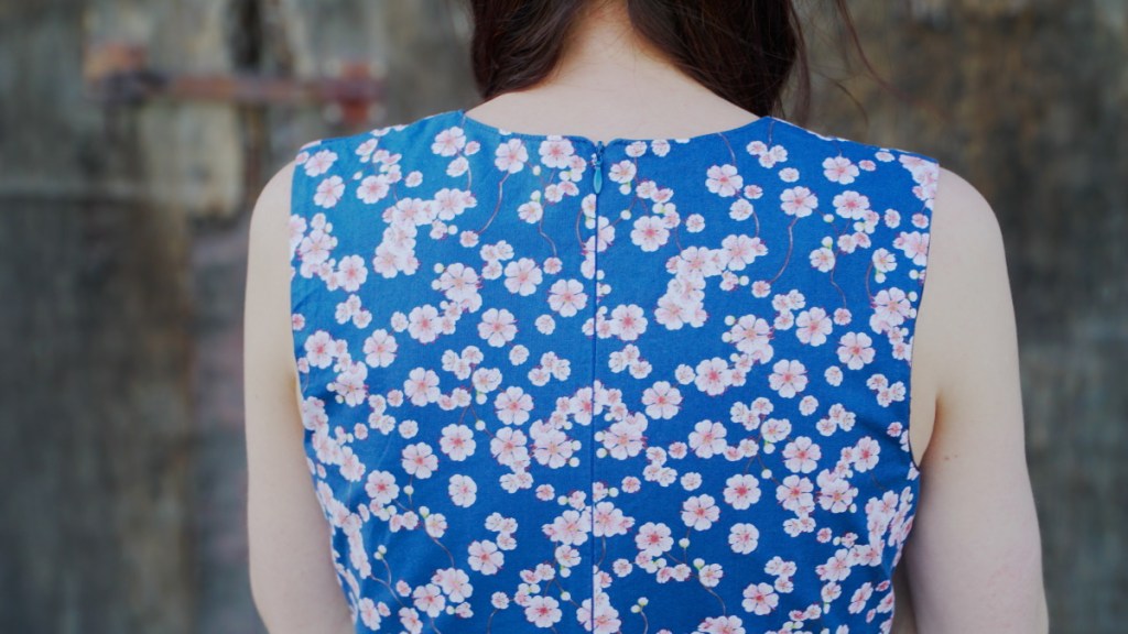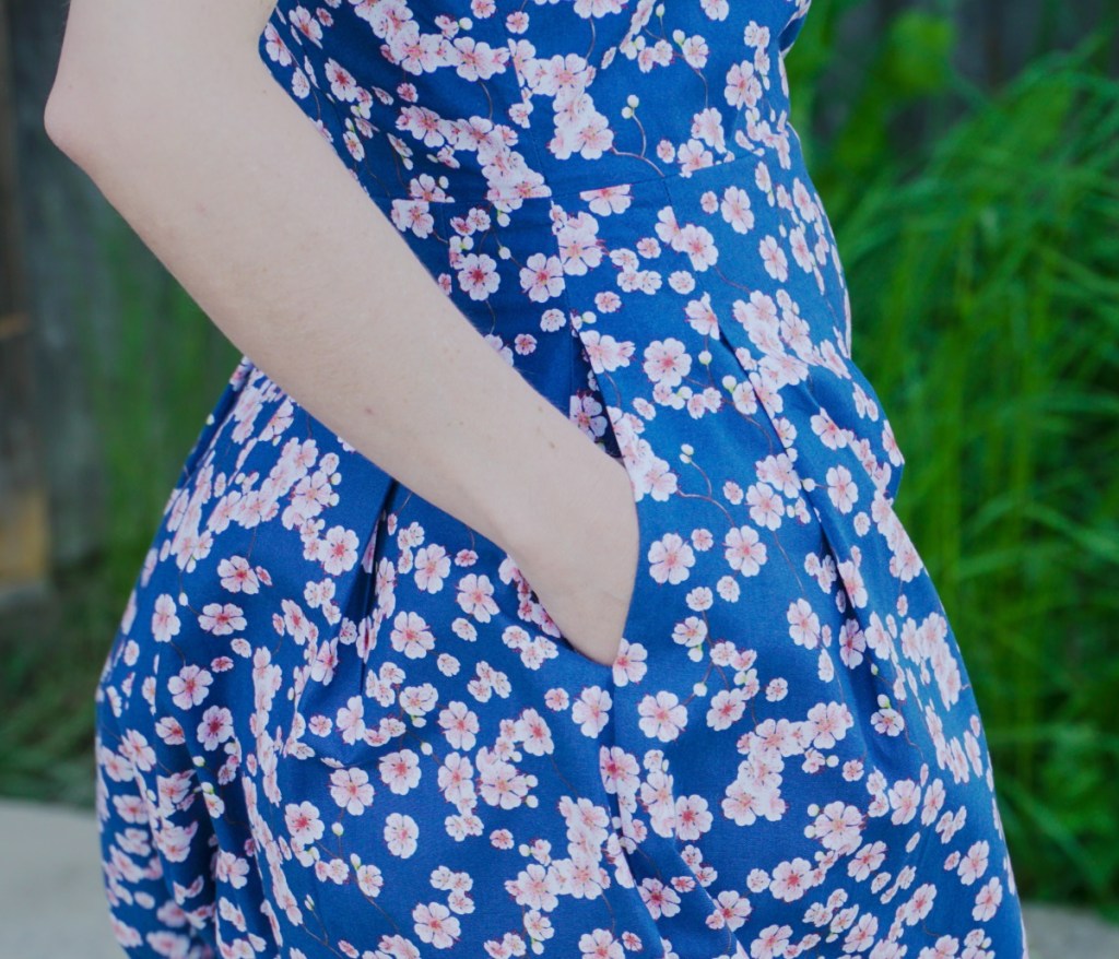 La robe se ferme dans le dos avec une fermeture éclair invisible. Elle comporte deux poches dans les coutures de côtés. Il ne me restait juste pas assez de tissu pour découper les deux fonds de poche dans le tissu aux fleurs: j’ai donc réalisé le fond de poche supérieur dans le tissu de doublure, ni vu ni connu. Cela me permet aussi d’avoir un peu moins d’épaisseur.