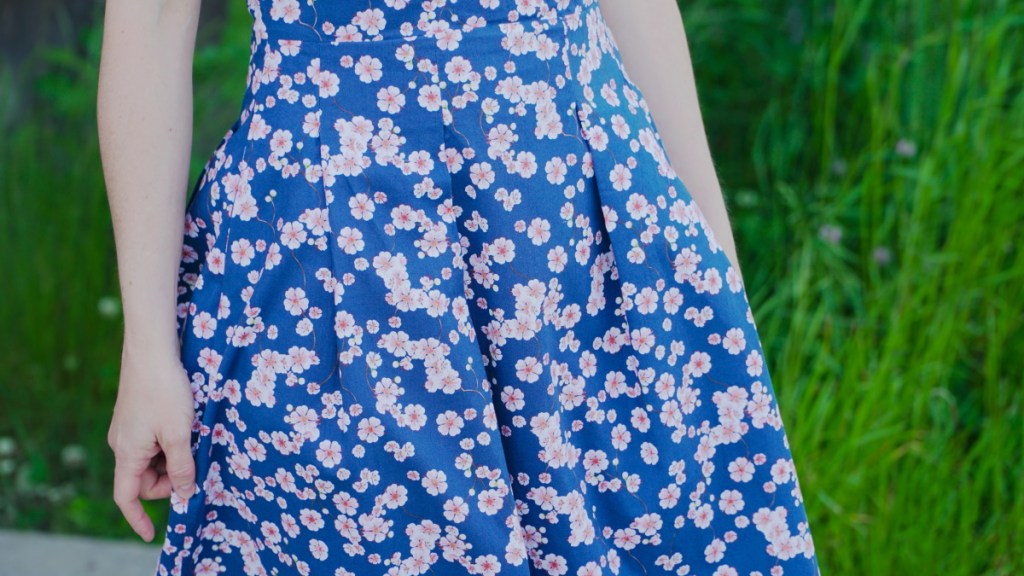 Quelques mots d’abord sur le tissu aux fleurs de cerisiers. Il s’agit d’un coton tout doux que j’avais acheté il y a longtemps en Espagne, dans un des deux seuls magasins de tissus de Salamanca. Ma couleur préférée combinée avec un motif de fleurs japonisant – il n’en fallait pas plus pour attirer mon regard! J’ai toujours eu envie de transformer ce tissu en une robe d’été virevoltante. En effet, sa bonne tenue le rendait idéal pour une jupe avec une certaine ampleur.