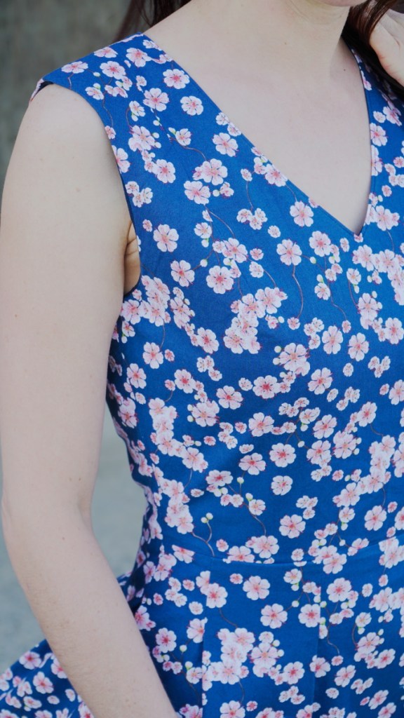 La robe est entièrement doublée d’une fine viscose bleu foncé. Cela me permet de finir joliment l’encolure et les emmanchures. En même temps, une doublure donne toujours plus de façon à une jupe ample, même sur un tissu de coton avec un peu de tenue. La seule modification que je dois faire pour adapter le patron à ma taille (34), est la suppression de 2 cm au centre devant et au centre dos. Avec cet ajustement, le résultat final est parfait.