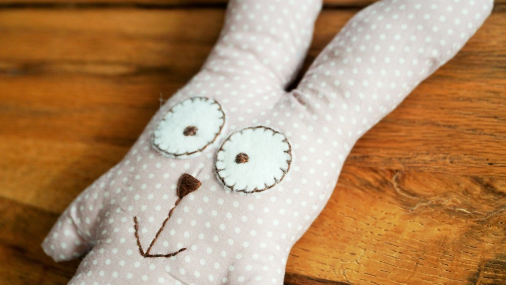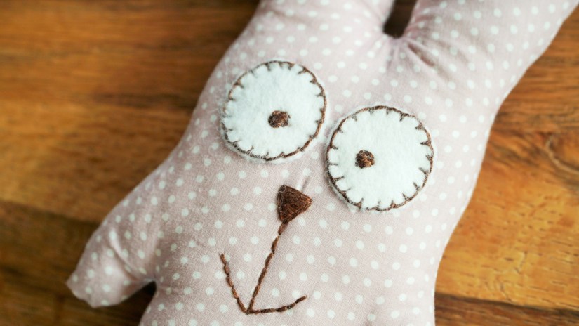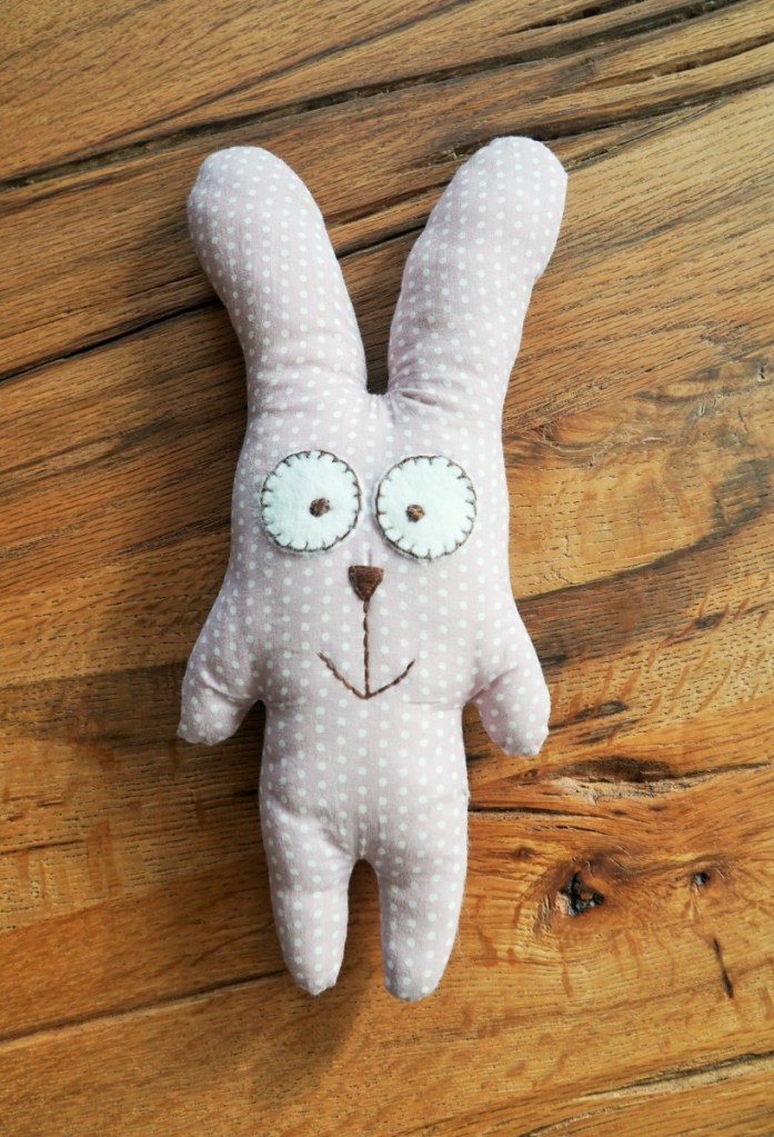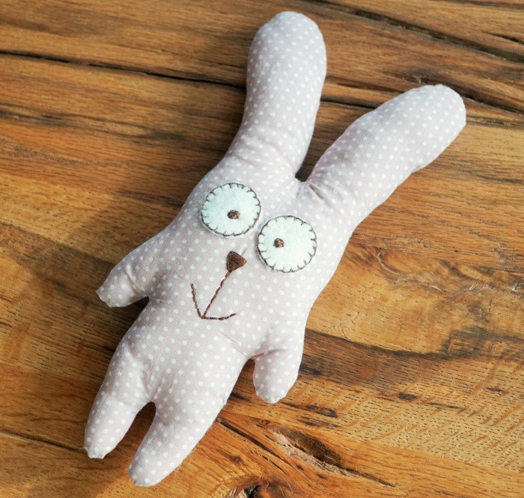 Le lapin mesure environ 25 cm de haut. Je le réalise dans un coton rose pâle à pois. Les deux pièces sont simplement assemblées l’une sur l’autre puis retournées et rembourrées de ouate. Les grands yeux du lapin sont des cercles de feutrine collés avec de la vlieseline double face et bordées d’un point de feston à la main pour bien les faire tenir. Les pupilles, le nez et la bouche sont également brodés à la main.
