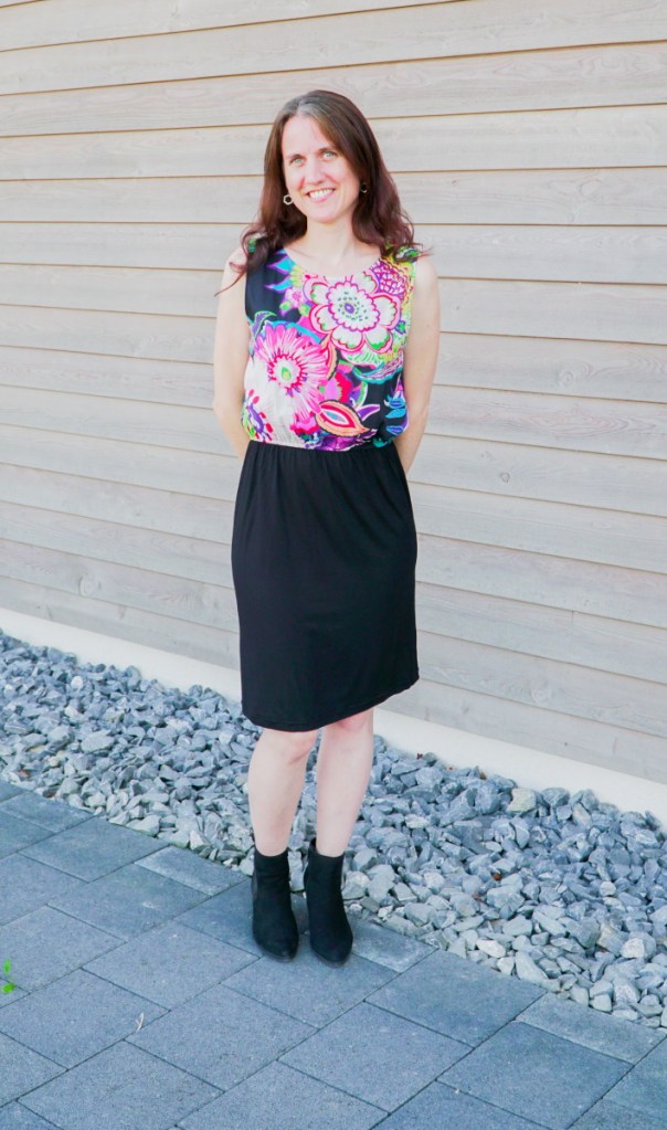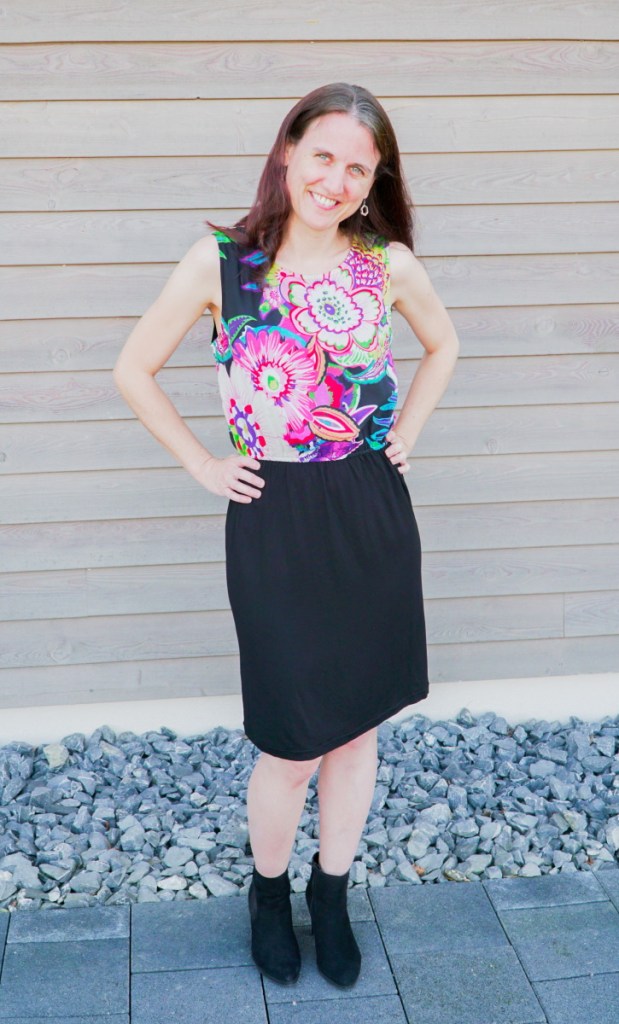 Comme j’adore les robes, je choisis de combiner le tissu fleuri de la blouse avec un jersey noir. Le modèle de cette petite robe toute simple (modèle 15) vient du numéro 6/2018 du magazine espagnol Patrones. Ce magazine est en vente Suisse allemande sous le titre Nähtrends, et en Suisse romande en tant que Couture actuelle. Le haut de la robe est prévu en broderie anglaise, le bas en jersey. Je réinterprète le modèle avec mon tissu fleuri en coton fin, que j’utilise pour le haut, et un jersey viscose uni noir pour le bas.