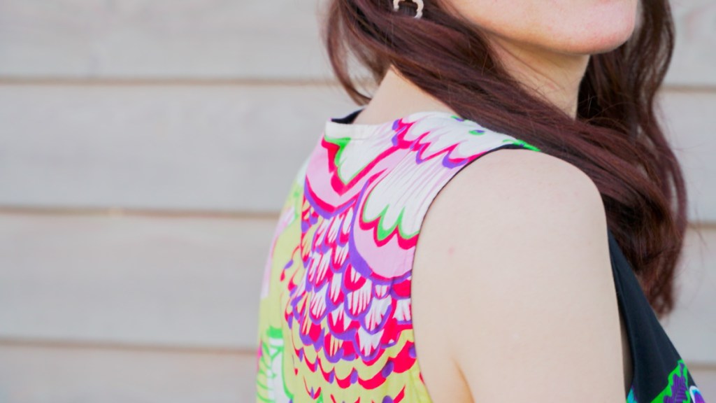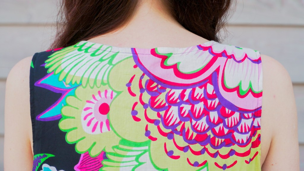 La mini-robe est en fait un projet recyclage pour une blouse à fleurs que je ne mettais jamais. J’avais craqué sur les couleurs vives du tissu en coton fin, mais la blouse était beaucoup trop large et mal coupée. Lors de notre déménagement, elle me retombe dans les mains. En bonne couturière aguerrie, je décide de la transformer en un autre vêtement plutôt que de la jeter aux vieux habits.