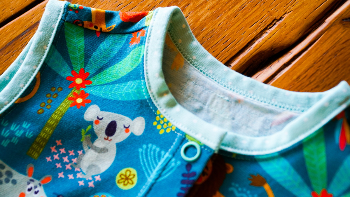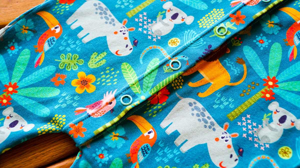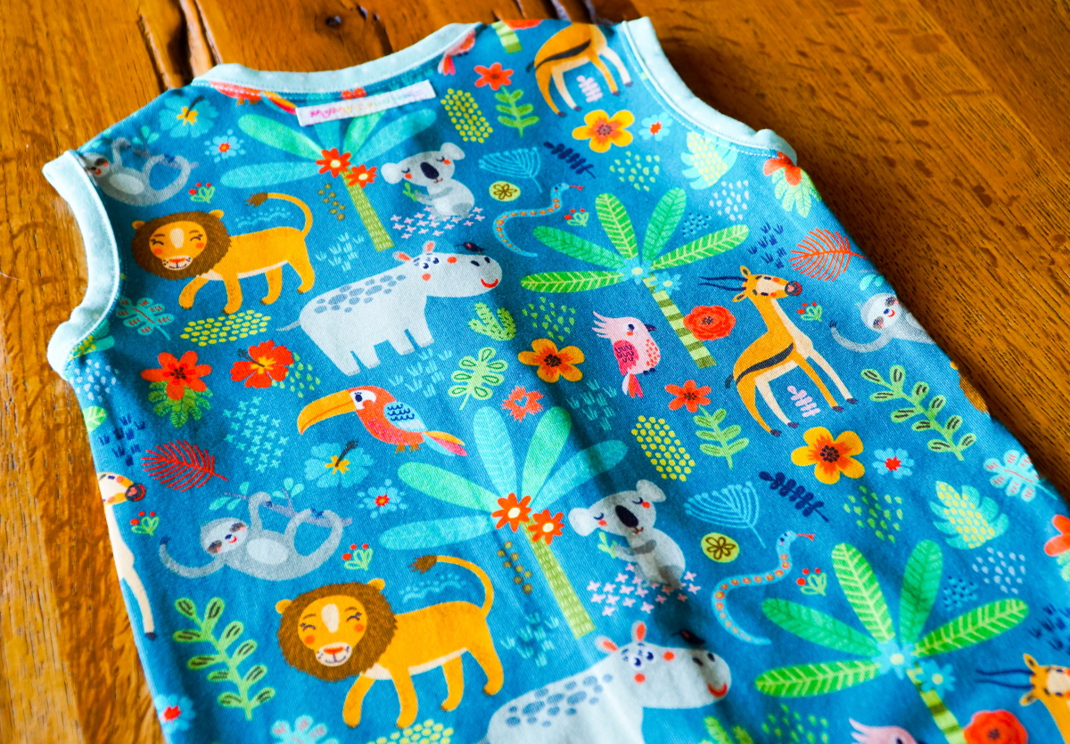 L’encolure et les emmanchures sont terminées avec un biais. Pour cette finition, je choisis un jersey vert tendre à pois pour contraster avec le motif coloré de la jungle. Le devant se ferme sur des boutons pressions turquoise. Enfin, je termine le modèle en apposant dans le dos mon étiquette MymyCréations.