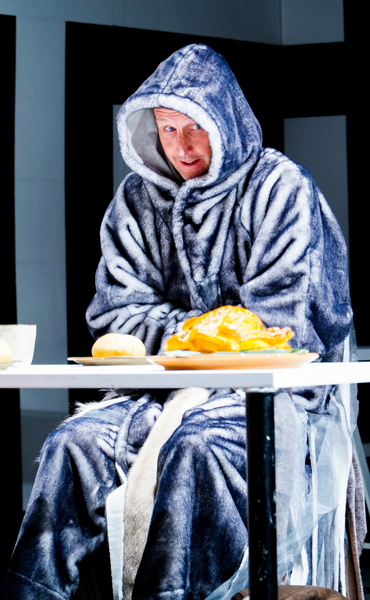 Enfin, pour le costume de Galgalim, étrange créature mi-homme mi-chien, je réalise un long manteau à capuche en fausse fourrure. Le patron est tiré du magazine Simplicity 6/2020 (modèle 4). Il est doublé d’un jersey gris clair assorti et se ferme sur le devant avec trois gros boutons pression. Pour rendre la fourrure encore plus inquiétante, j’y attache des restes de fourrure et d’autres bouts de tissu assortis. Heureusement que le comédien ne porte ce manteau que dans deux scènes relativement courtes: en effet, il lui tient bon chaud sous les projecteurs!
