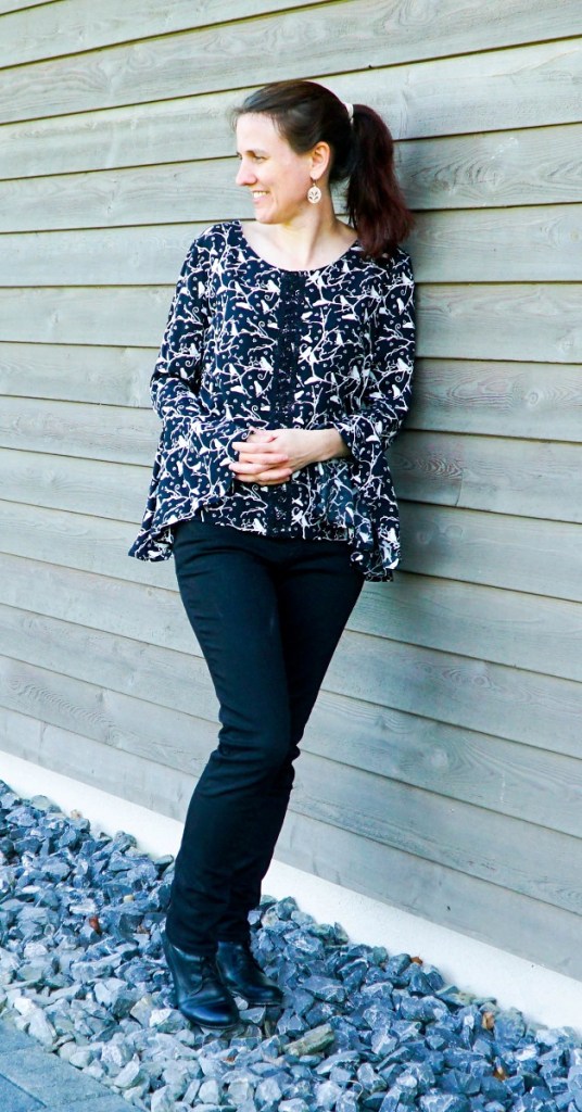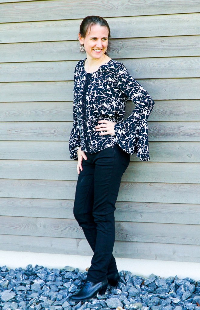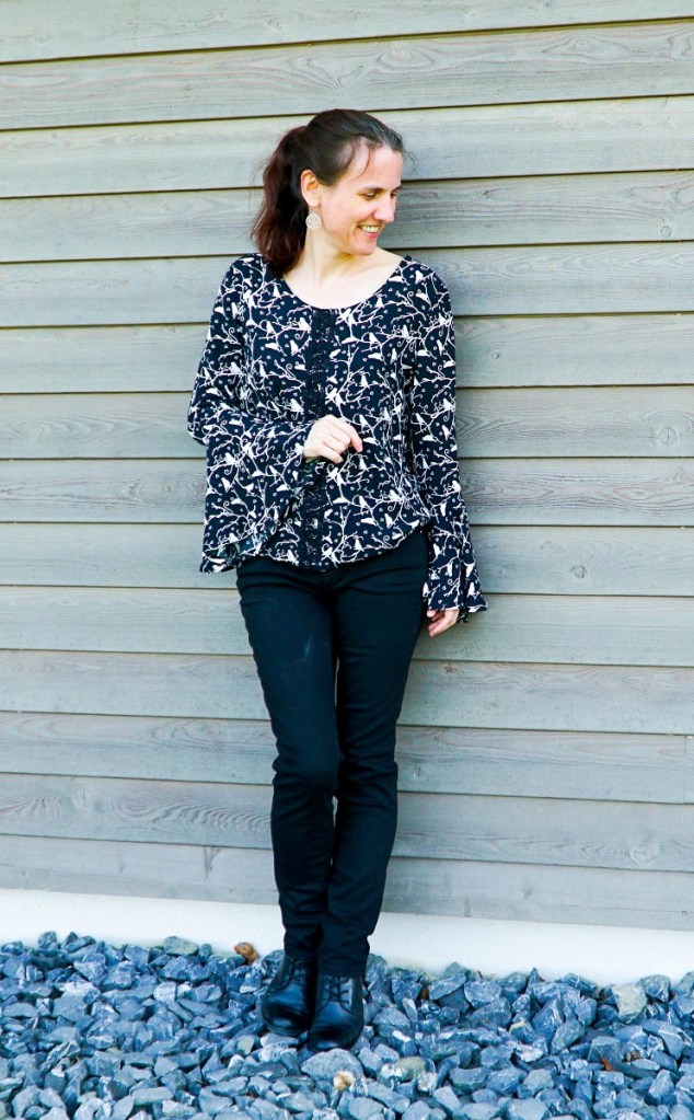 Et pourtant, la réalisation de ce modèle n’a pas été un long fleuve tranquille! J’avais d’abord acheté le tissu aux soldes dans un magasin à Berne, alors que j’habitais encore à Ostermundigen. Il s’agit d’une fine viscose noire à l’imprimé tendre d’oiseaux et de branches. J’ai découpé toutes les pièces pour réaliser la blouse n°14 du magazine Milliblu’s n°4 2018. Comme d’habitude, après avoir pris les mesures nécessaires, j’avais réduit le patron de 2cm au centre devant et centre dos. Mais après assemblage des pièces, je me suis rendu compte que la blouse était malheureusement trop serrée.