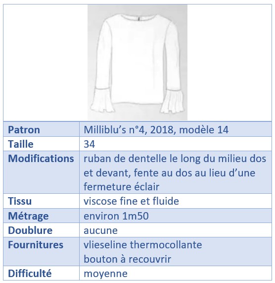 Après tant de mois dans le tiroir des inachevés, je suis très contente du résultat final. J’aime beaucoup les volants de la blouse, très élégants même s’ils ne sont pas toujours très pratiques à porter! Le ruban de dentelle dans le devant et le dos apporte une touche originale au modèle.