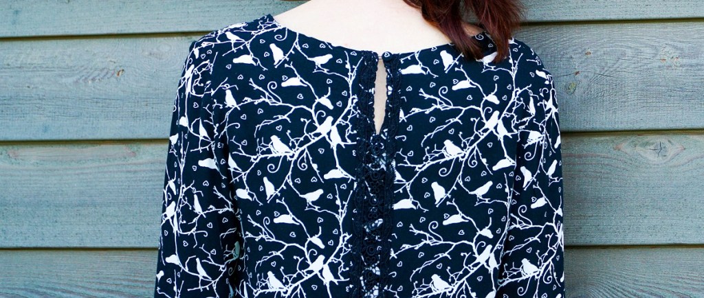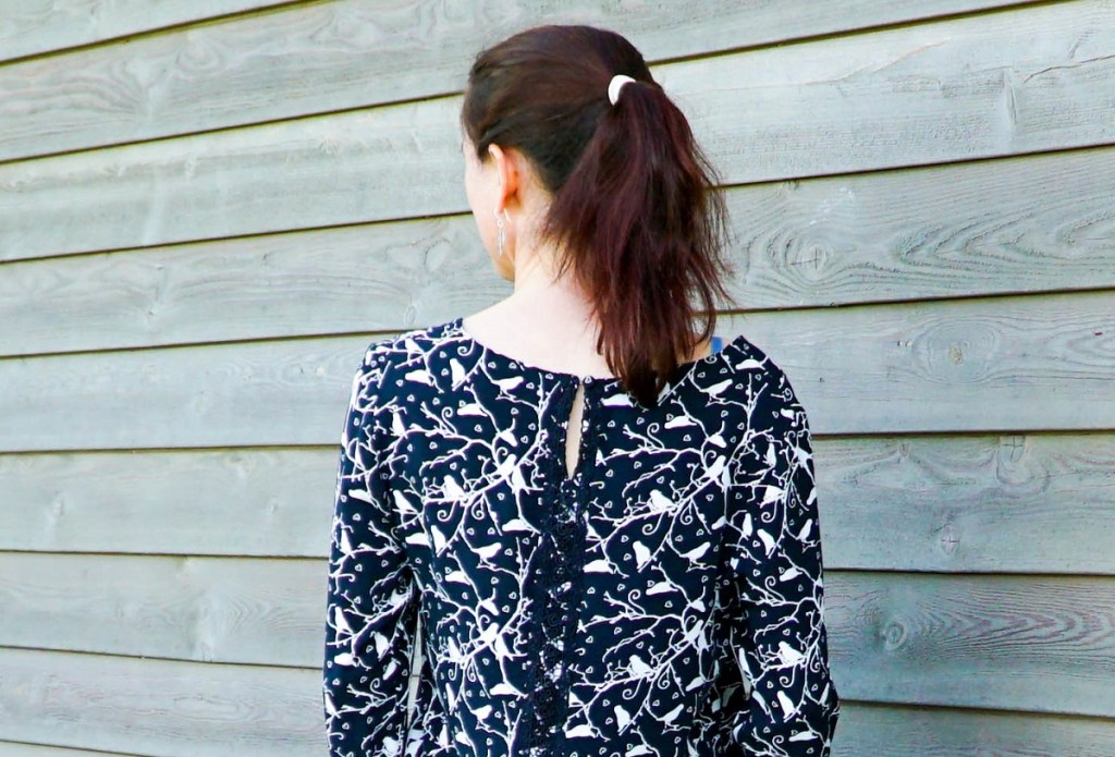 Le modèle est donc resté plusieurs mois dans mon tiroir des inachevés. Ce n’est qu’une fois installée dans notre nouvelle maison à la campagne que je l’ai enfin ressorti… et que j’ai réfléchi à la meilleure manière de rattraper le coup. Je n’avais définitivement pas assez de tissu pour redécouper les pièces. Finalement, j’ai simplement découpé le milieu dos et le milieu devant pour y ajouter une bande de tissu de 2 cm de large. Afin que l’ajout ne se voie pas, je couvre cette bande d’un joli ruban de dentelle noire. Dans le dos, je ménage une fente – au lieu d’une fermeture éclair comme prévu par le modèle – qui se termine sur un bouton recouvert de tissu.