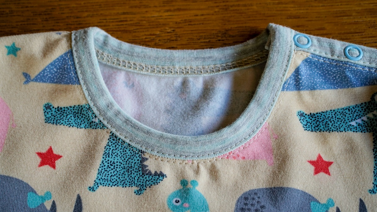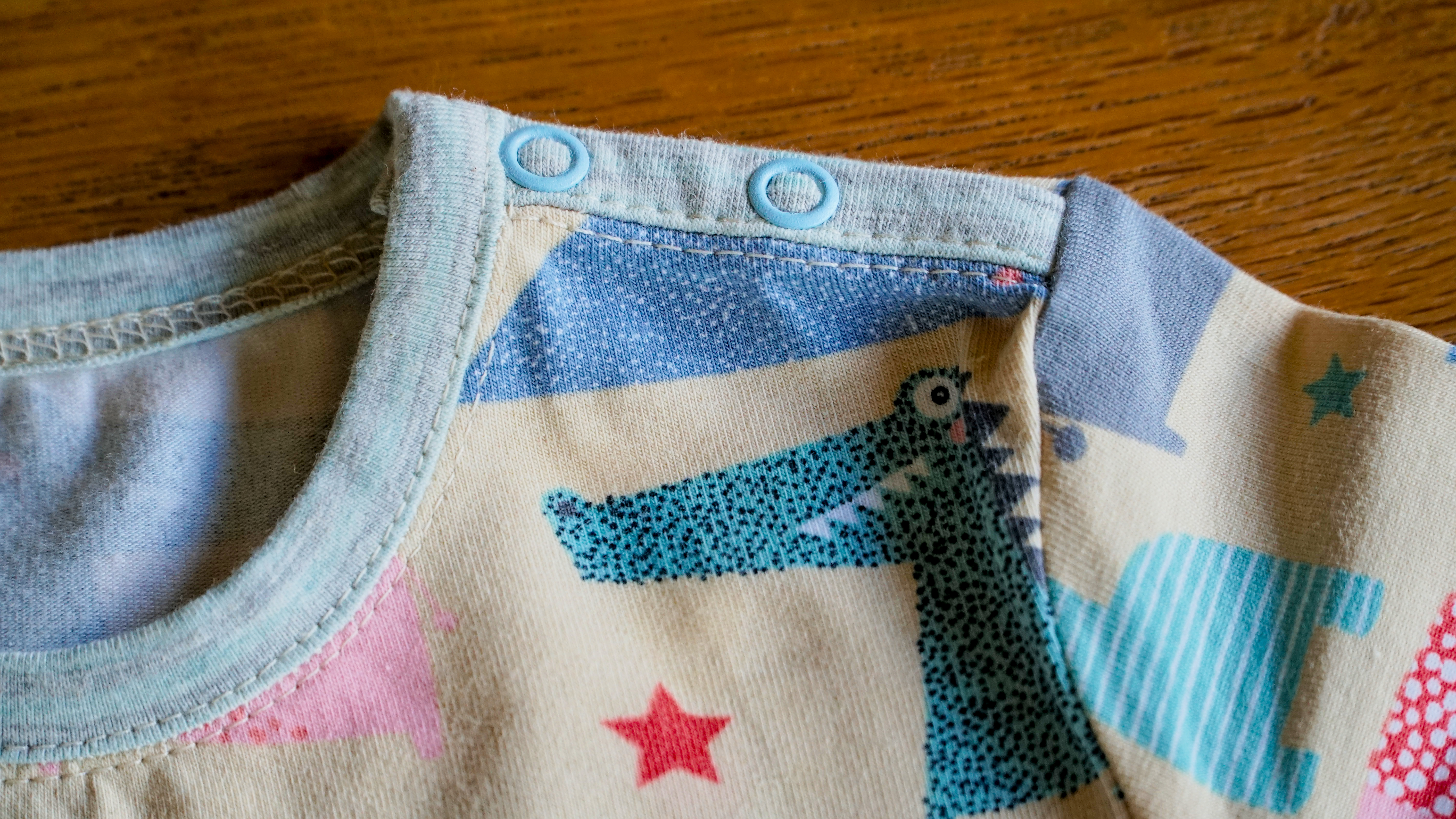 La patte de boutonnage requiert un peu de minutie, comme d’habitude. Il faut la renforcer de vlieseline thermocollante pour qu’elle reste bien stable. L’encolure est ensuite terminée par une simple bande de jersey que je fixe avec un point double de ma nouvelle Babylock Coverstitch. Pour fermer l’épaule, je choisis deux boutons pression bleu clair de la marque Prym mini.