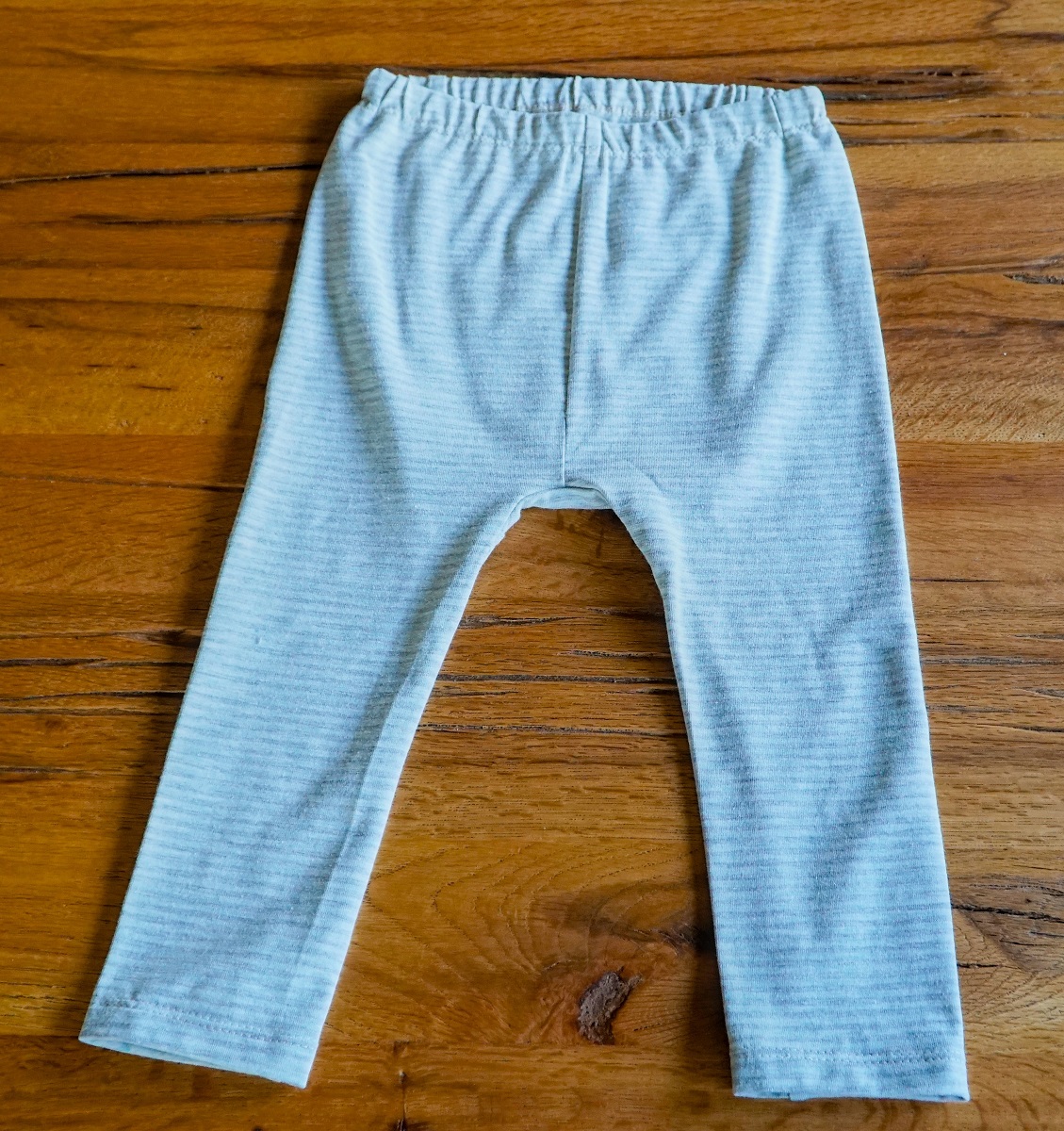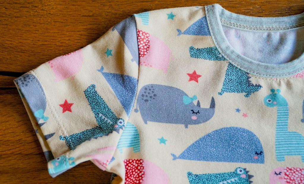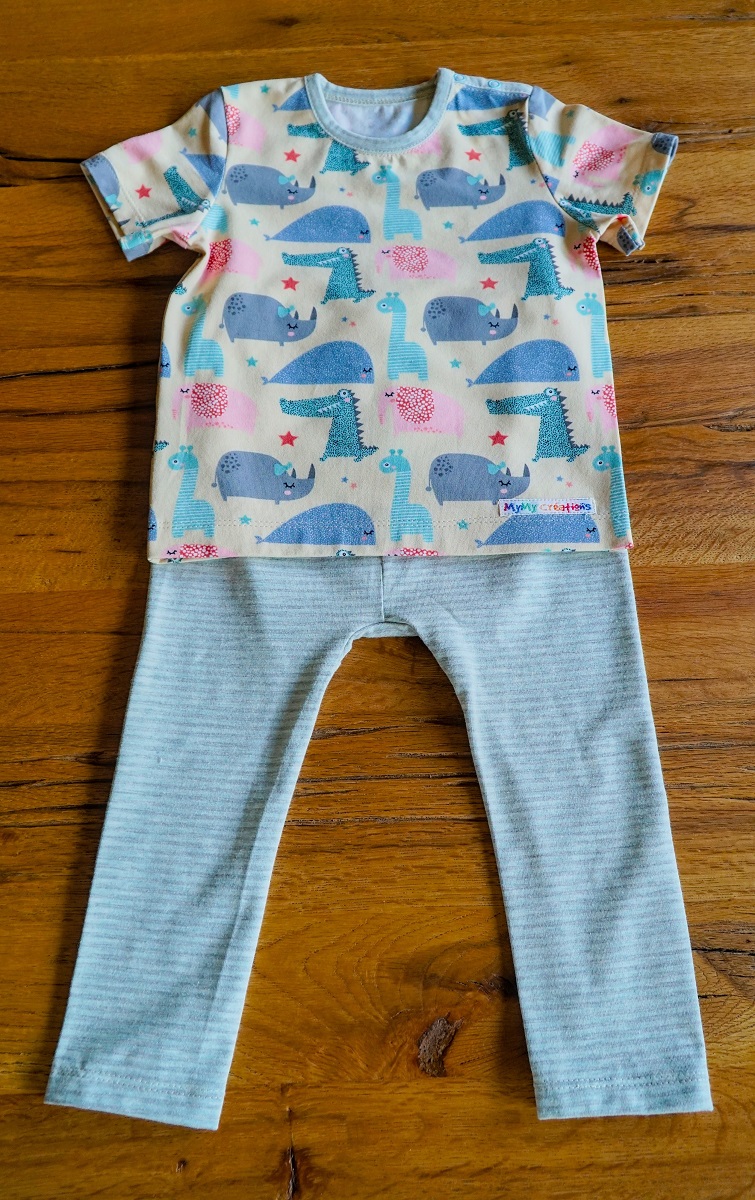 Le modèle de t-shirt vient du dernier magazine Ottobre (été 2022). Il s’agit d’un modèle relativement simple avec une patte de boutonnage sur l’épaule gauche. Je choisis d’utiliser deux tissus jersey de coton, l’un avec de sympathiques animaux aux couleurs pastels, l’autre avec des rayures grises et turquoise. Inspirée par ce tissu assorti, je décide de compléter la tenue par un simple pantalon de type leggings dont je trouve le patron dans le magazine Ottobre n°1 de 2018 (modèle 3). Je l’avais déjà cousu une fois en taille 62 pour des jumeaux en février 2019. Cette fois, comme le petit garçon aura bientôt une année, je me décide pour une taille 80, idem pour le t-shirt.
