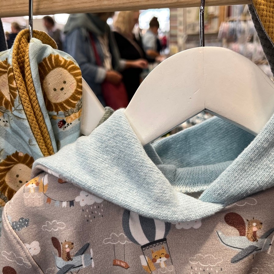 Tout au long du salon, je collecte quelques inspirations pour mes créations… Quelques patchworks aux motifs de courges (de saison), mais aussi des idées originales pour les vêtements de bébés (la doublure de la capuche dans un tissu contraste, j’adore!).