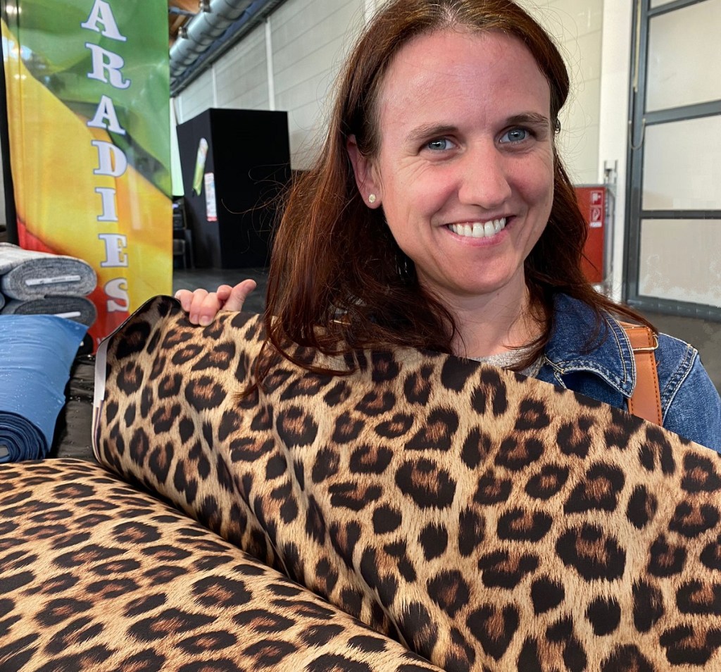 Après la salle d’exposition, nous entrons dans la salle des ventes. Un stand après l’autre nous attire avec une pléthore de tissus et d’autres accessoires colorés. Ma maman trouve quelques beaux coupons pour ses projets de patchwork. De mon côté, je déniche un tissu rouge vif pour un joli manteau que je prévois de coudre cet hiver (le patron est déjà tout choisi). Prise de frénésie, j’achète aussi un tissu softshell au motif léopard… Le softshell se trouve partout cette saison: il est très facile à coudre et se prête à la création de petites vestes confortables pour la mi-saison. Ma maman, de son côté, est fascinée devant la machine automatique de quilting de la marque Handi Quilter, un monstre qui occupe la moitié du salon…