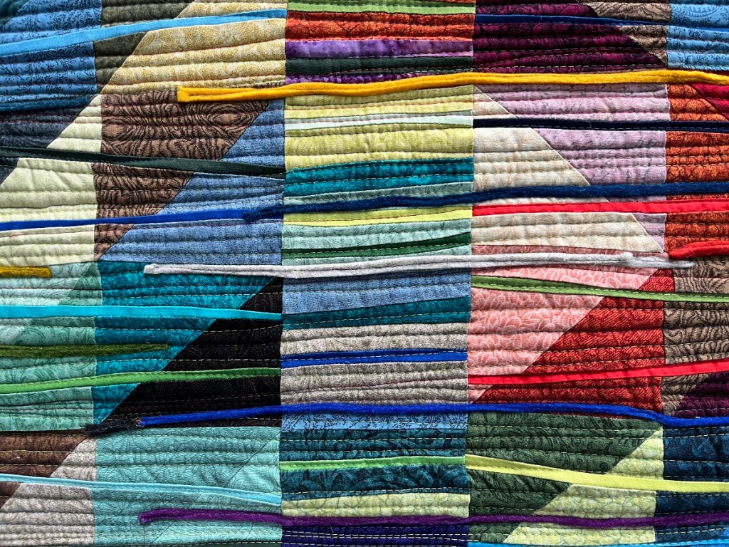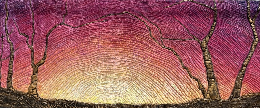 Le salon s’ouvre sur une exposition d’artistes textiles, en particulier de patchwork. Des ouvrages impressionnants, d’une précision à couper le souffle. Nous nous laissons bercer par l’inspiration… Tant de bonnes idées! Et les dames qui présentent leurs ouvrages sont ravies de nous parler de leur passion. Voici un aperçu de quelques créations qui m’ont particulièrement touchée.