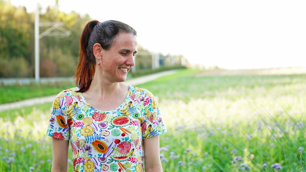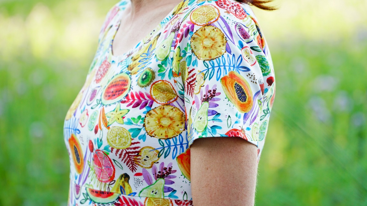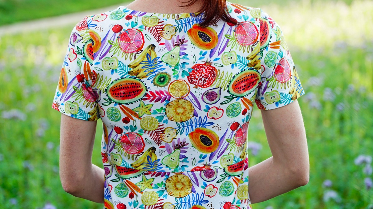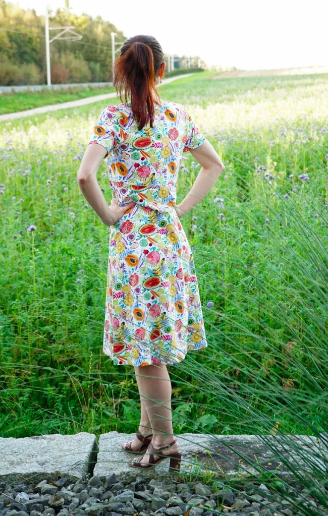 Le tissu est un jersey de coton au toucher soyeux. Son motif fruité et coloré met de bonne humeur. Le haut de la robe a une encolure ronde loin du cou. Une découpe juste sous la poitrine permet de mettre en forme joliment la jupe, qui se déploie généreusement en forme trapèze jusqu’aux genoux.