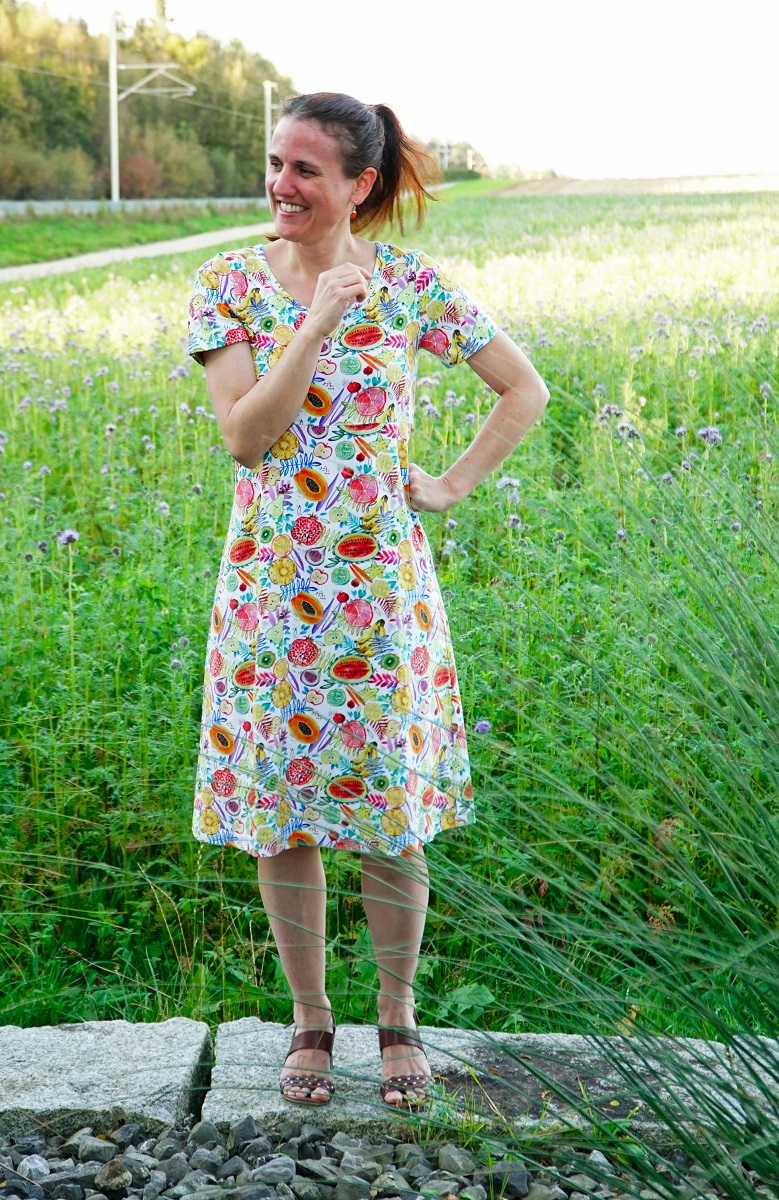 Je suis très satisfaite du résultat: la robe est très confortable et pratique pour l’été. Elle a juste la bonne longueur pour pouvoir la porter au bureau malgré la légèreté de son motif fruité. J’adore le modèle et j’ai bien l’intention de le coudre encore dans d’autres tissus!