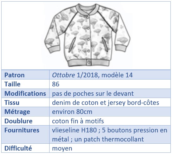Le patron vient bien sûr – comme souvent lorsque je couds pour les tout petits – du magazine Ottobre. Il s’agit du modèle 14 du numéro de janvier 2018. La veste porte le doux nom de Kantarelli (oui, les nordiques aiment donner des noms à leurs designs…), et il est même possible de la coudre de manière à ce qu’elle soit réversible (ce que j’ai renoncé à faire, vu le choix de mes tissus). J’ai également renoncé – par manque de temps – à réaliser les poches coupées dans le devant: je m’y essaierai une autre fois, promis!