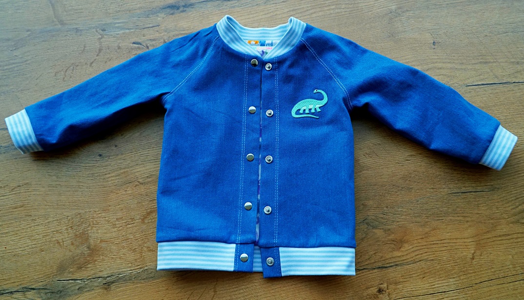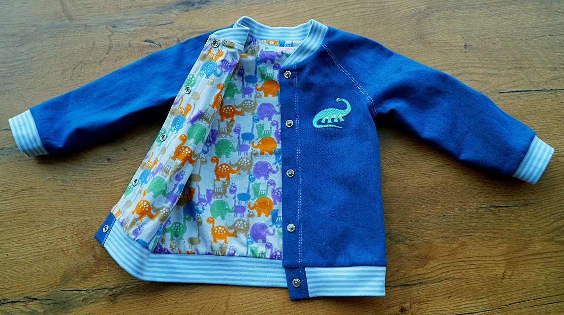 Comme la veste me semble encore un peu « nue » sur le devant, je parcours les magasins de bricolage à Berne pour dénicher le parfait petit supplément: un patch dinosaure thermocollant adorable, dans les mêmes couleurs que mon tissu de doublure. J’adore! D’ailleurs, j’aime beaucoup utiliser les patchs thermocollants sur les vêtements de bébé, j’en ai toute une collection…