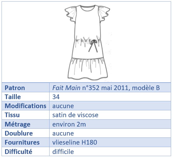 Le modèle comporte un devant et un dos droit, sans pinces, agrémentés d’un large volant à la base. La première difficulté consiste à coudre les innombrables fronces réalisées sur ce volant.