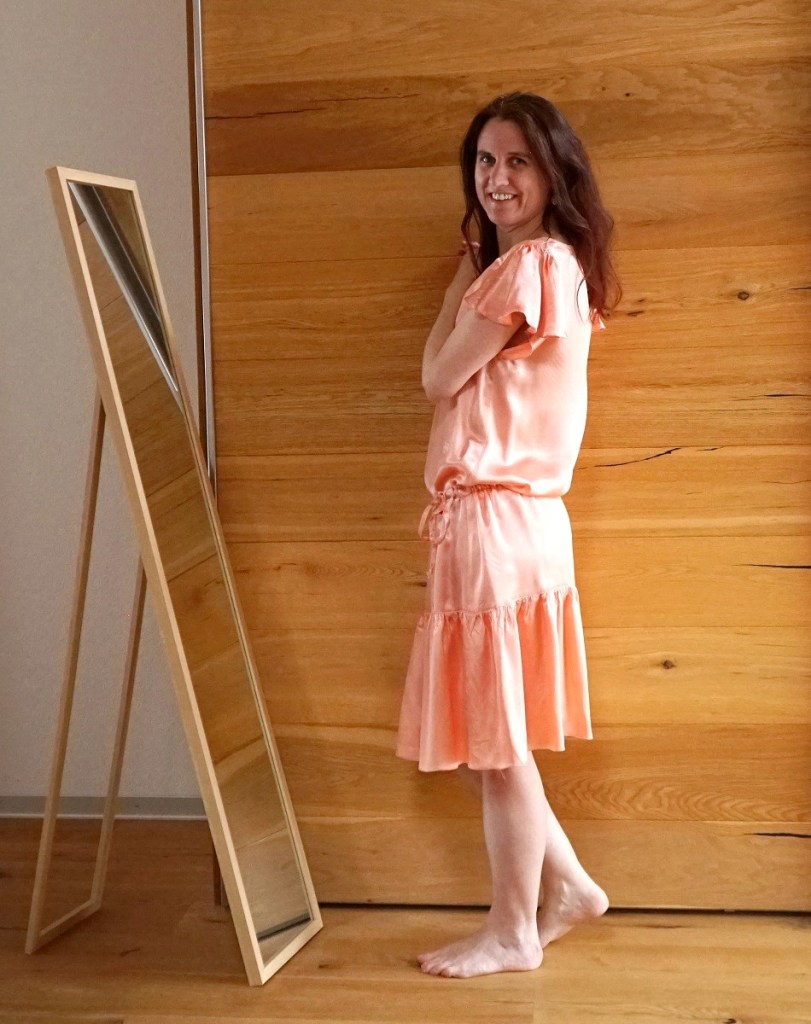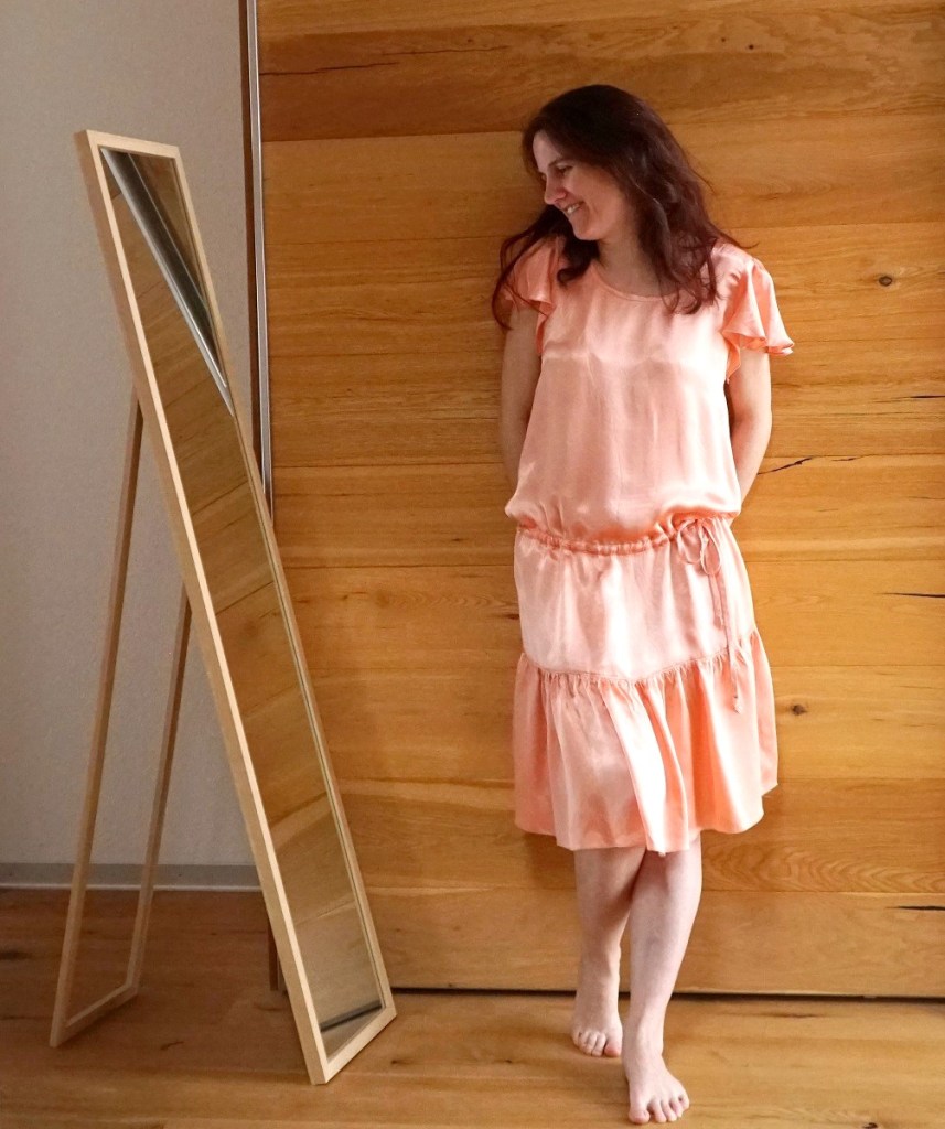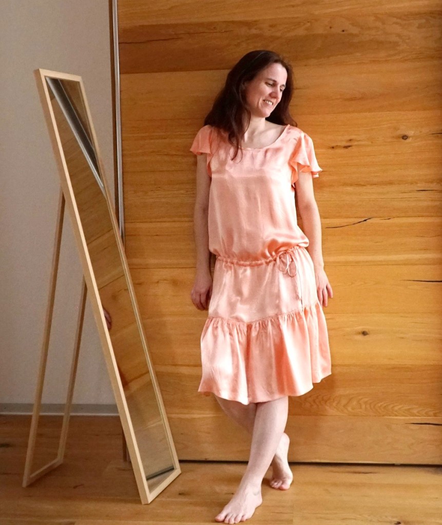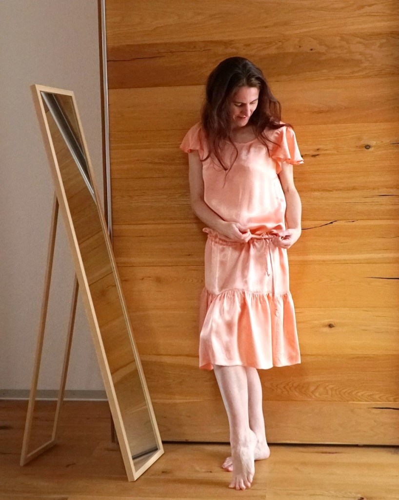 Avec son tissu satiné, son aspect romantique et ses nombreux détails couture, cette robe originale est un modèle trop mignon. Pour pouvoir la porter en public, on pourrait la coudre dans un tissu plus « passe-partout » – un joli lin mélangé à de la viscose par exemple? Je n’exclus pas de la coudre une deuxième fois, mais cette fois je prendrais soin de placer la ceinture un peu plus haut et de raccourcir légèrement la robe: en effet, pour la longueur de mon corps, la taille est juste un peu trop basse et la jupe un tout petit peu trop longue.