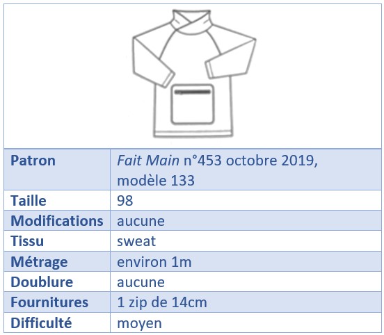 C’est en fait le modèle de pull à col montant qui m’a donné envie de ressortir ce tissu. J’ai trouvé le patron dans le magazine Fait Main n°453 de octobre 2019. La pièce contient deux détails couture intéressants: un col montant croisé sur le devant, ainsi qu’une poche plaquée qui s’ouvre sur un zip apparent.