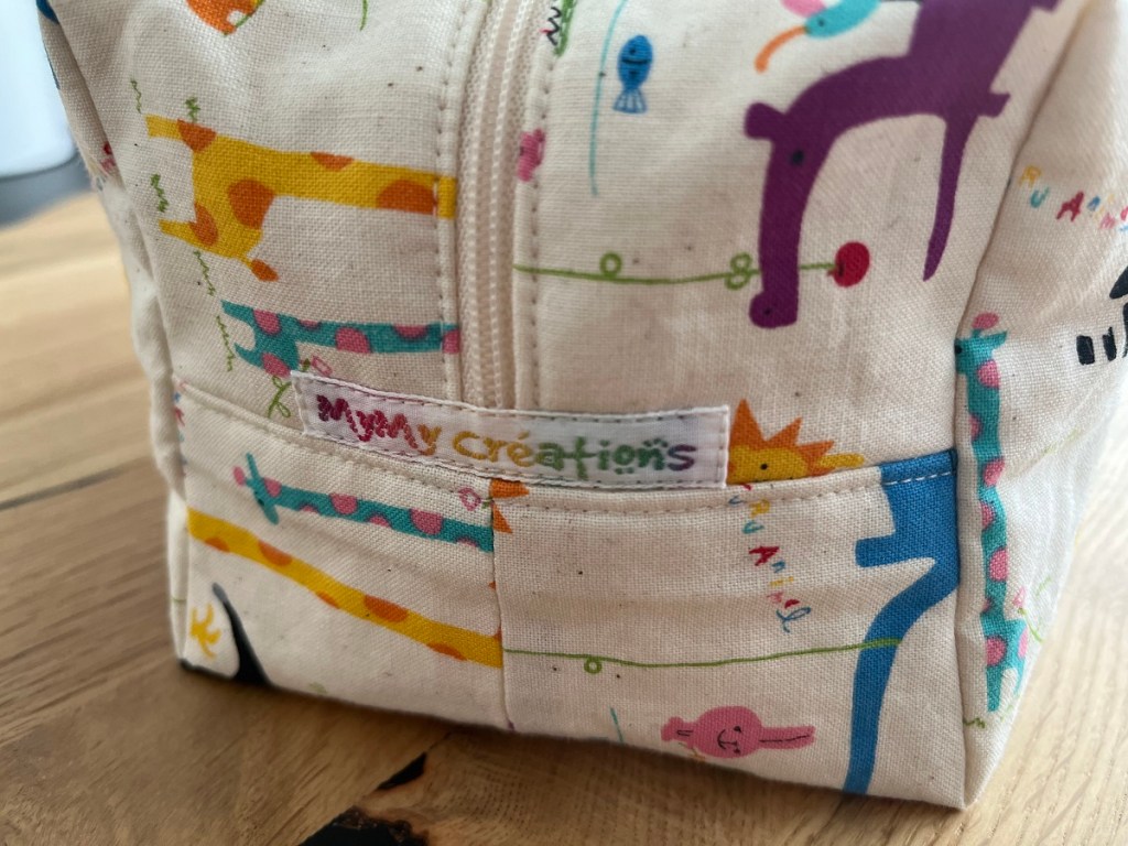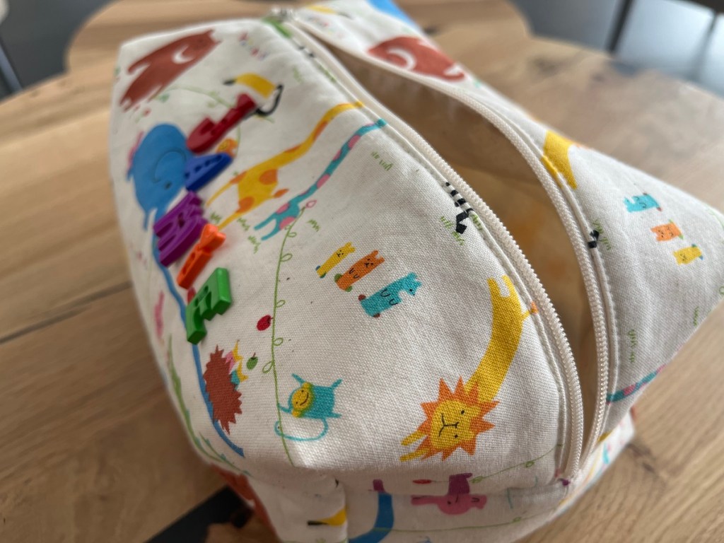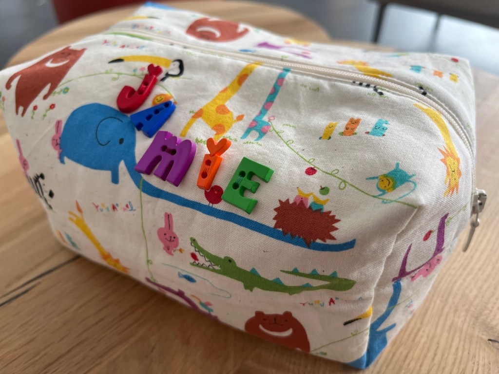 La deuxième trousse est réalisée exactement selon le même patron, mais dans une taille plus petite. Elle est destinée, comme vous pouvez l’imaginer!, à mon neveu Jamie. Le tissu est un coton au motif d’animaux colorés trop mignons. Un coup de coeur que j’ai acheté immédiatement en pensant à Jamie!