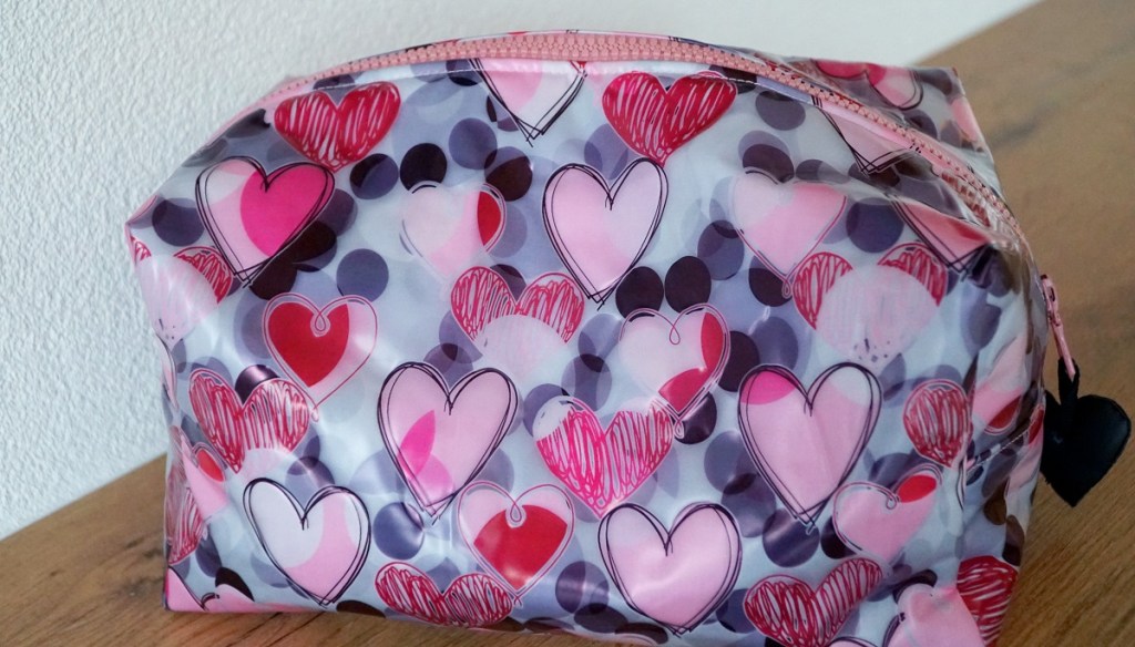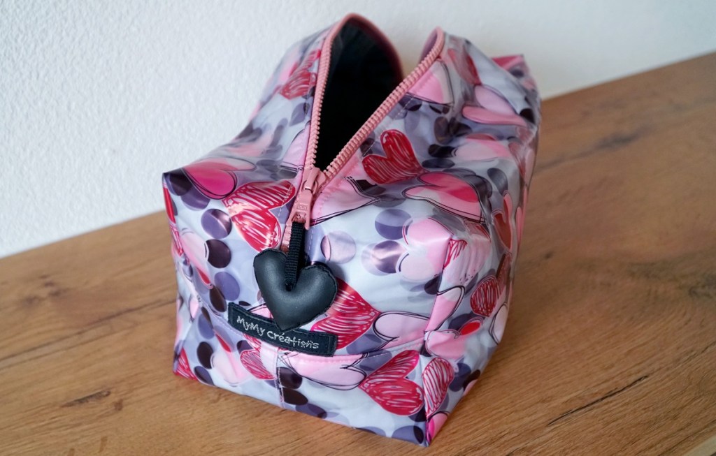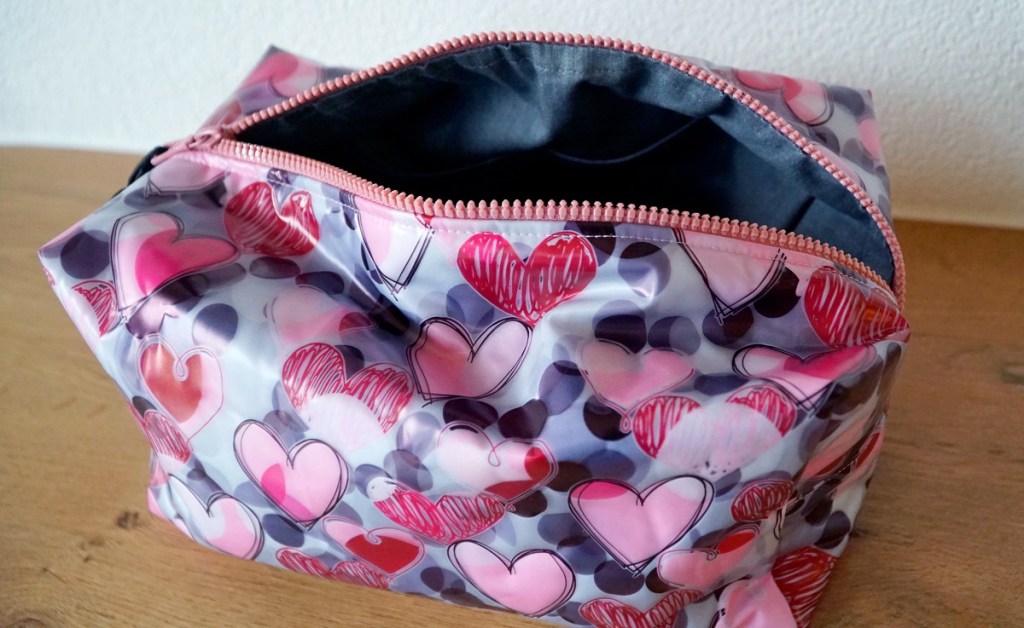 La trousse aux coeurs est un cadeau d’anniversaire pour ma belle-soeur. Je lui avais déjà cousu une trousse de toilette semblable il y a environ 10 ans. Comme cette trousse a souffert du temps qui a passé, le moment était venu d’en coudre une nouvelle. Le modèle hyper pratique et vite cousu – que j’ai déjà réalisé en maintes occasions – vient du magazine Burda de décembre 2013.
