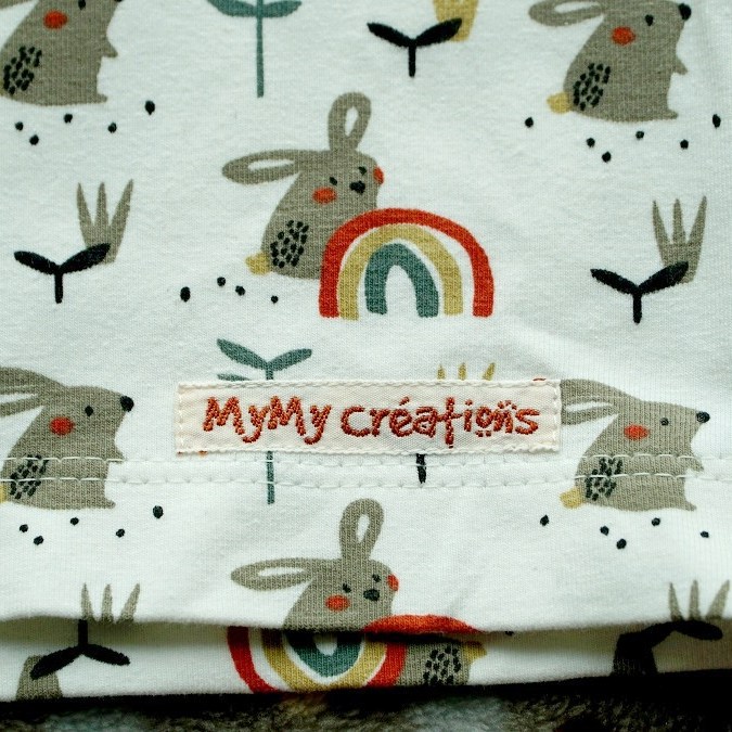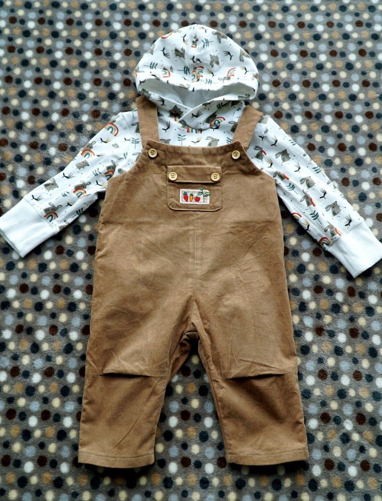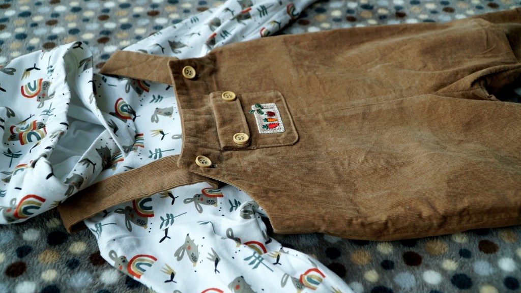 Pour cette création bébé, j’ai puisé une fois de plus dans mes magazines Ottobre, une valeur sûre pour les tout petits! Les deux modèles viennent du numéro enfants de printemps 2022. J’ai d’abord craqué pour la capuche trop mignonne, et puis j’ai pensé qu’elle ferait bel effet sur la petite salopette stylée. Pas besoin d’aller faire les magasins, j’avais tous les tissus qu’il me fallait: un reste de jersey de coton avec des lapins mignonissimes (que j’avais déjà utilisé il y a deux ans pour la naissance de mon neveu), ainsi qu’un velours milleraies brun clair dont la couleur s’associait parfaitement. J’ai juste dû acheter un bout de bord-côtes blanc (pour les poignets) et un jersey de coton blanc (pour doubler la capuche). Le modèle de Ottobre ne prévoyait pas de doubler la capuche, mais je trouve que cela rend définitivement plus joli.