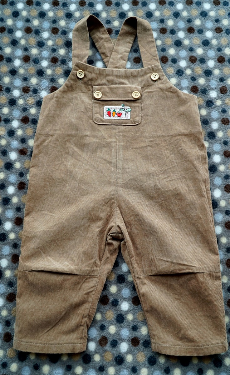 La salopette maintenant! Premier détail technique: elle comporte des plis d’aisance aux genoux devant, afin de ne pas gêner bébé lorsqu’il se met à ramper. Il faut les fixer avant d’assembler le devant et le dos. Le dos est assorti d’un élastique large pris dans les coutures de côté. Une parementure termine le devant. Enfin, les bretelles sont cousues dans le dos, croisées puis fixées sur le devant avec des boutons (deux boutons par bretelle afin d’adapter la salopette à la taille de l’enfant).