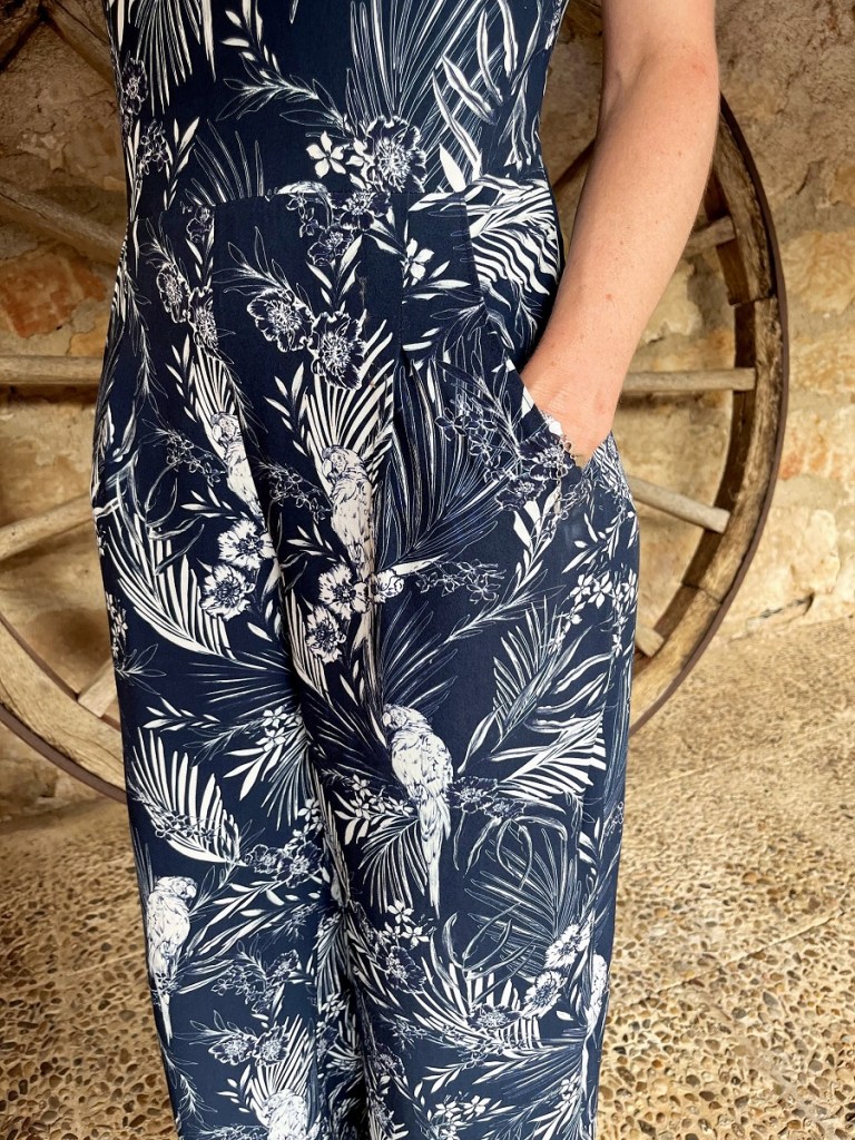 J’achète le tissu dans un magasin à Salamanca. Le genre de magasin dont rêvent toutes les couturières amateurs: des étagères qui regorgent de coupons de tissu de toutes les couleurs et de toutes les façons, un joyeux désordre, aucune indication de composition ni de métrage – vous choisissez votre coupon « à l’oeil » et il sera mesuré à la caisse pour calculer le prix! J’achète trois coupons pour un total de 7m de tissu, pour un peu plus de 30 euros, donc une moyenne de 4,5 euros par mètre! Le tissu que je choisis pour ma combinaison est une qualité fine et fluide – probablement de la viscose avec un petit pourcentage d’autre chose, élasthane ou polyester – d’une belle couleur bleu nuit avec un motif de feuilles et de perroquets. Léger, estival et exotique, juste parfait pour ma combinaison!