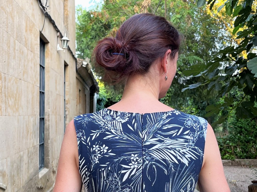 L’assemblage du haut et du bas ainsi que la couture de l’entrejambe sont relativement simples. Je termine le bas du pantalon avec un ourlet double. Il s’agit ensuite d’insérer la fermeture éclair invisible dans le dos – facile avec le pied presseur correct que j’ai eu la présence d’esprit d’emmener dans mes bagages!