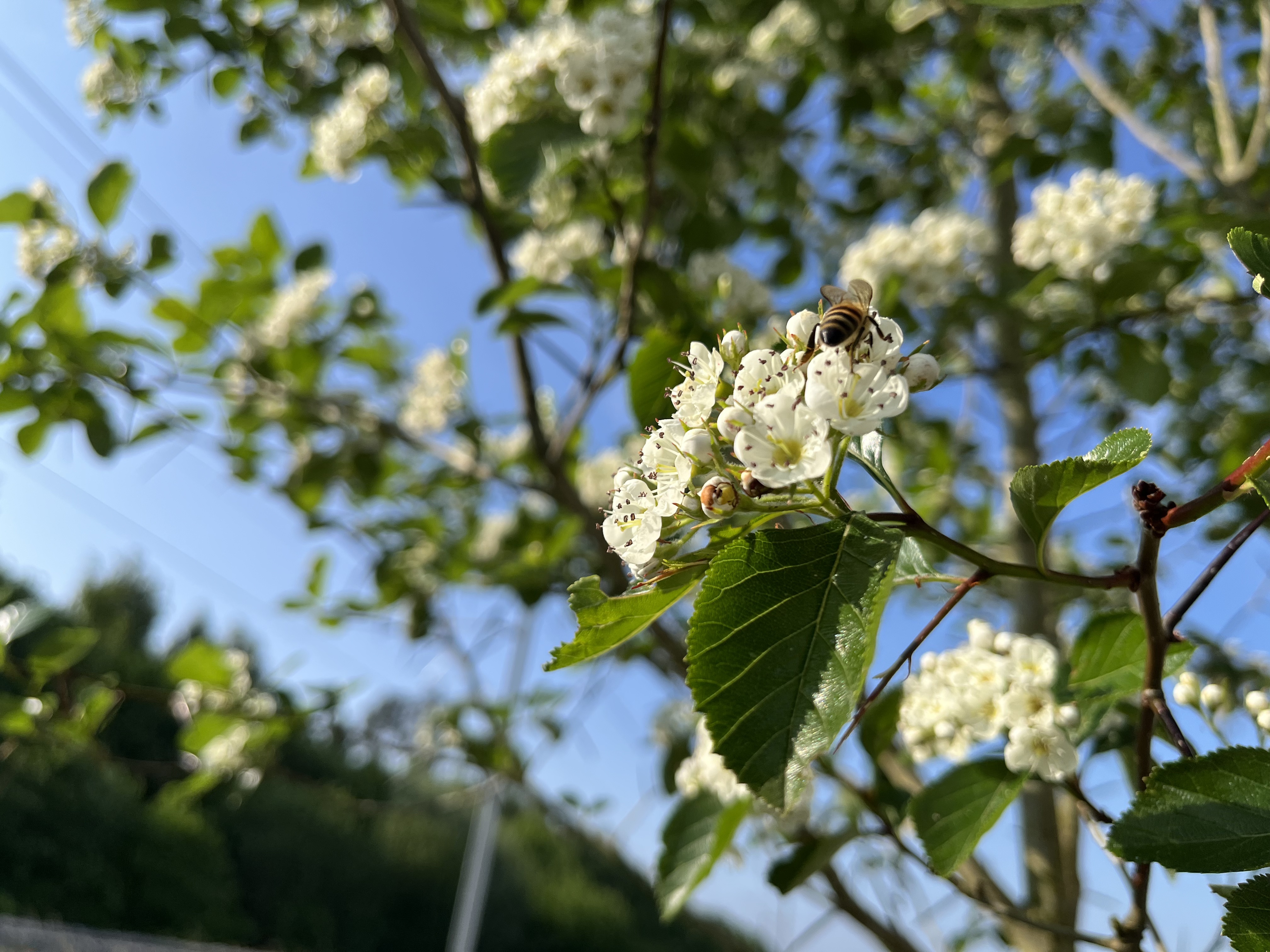 Au printemps 2023, les jardiniers terminent de planter les arbustes, les nombreuses fleurs, ainsi que notre petit arbre qui devra nous faire bénéficier de son ombre. Il s’agit d’un Crataegus, communément appelé aubépine en français. Rustique et peu exigeante, l’aubépine supporte des températures jusqu’à -20 degrés. Au printemps, elle se pare de petites fleurs blanches qui attirent les abeilles. En automne, elle porte de petits fruits rouges dont les oiseaux raffolent. Tout pour nous plaire!
