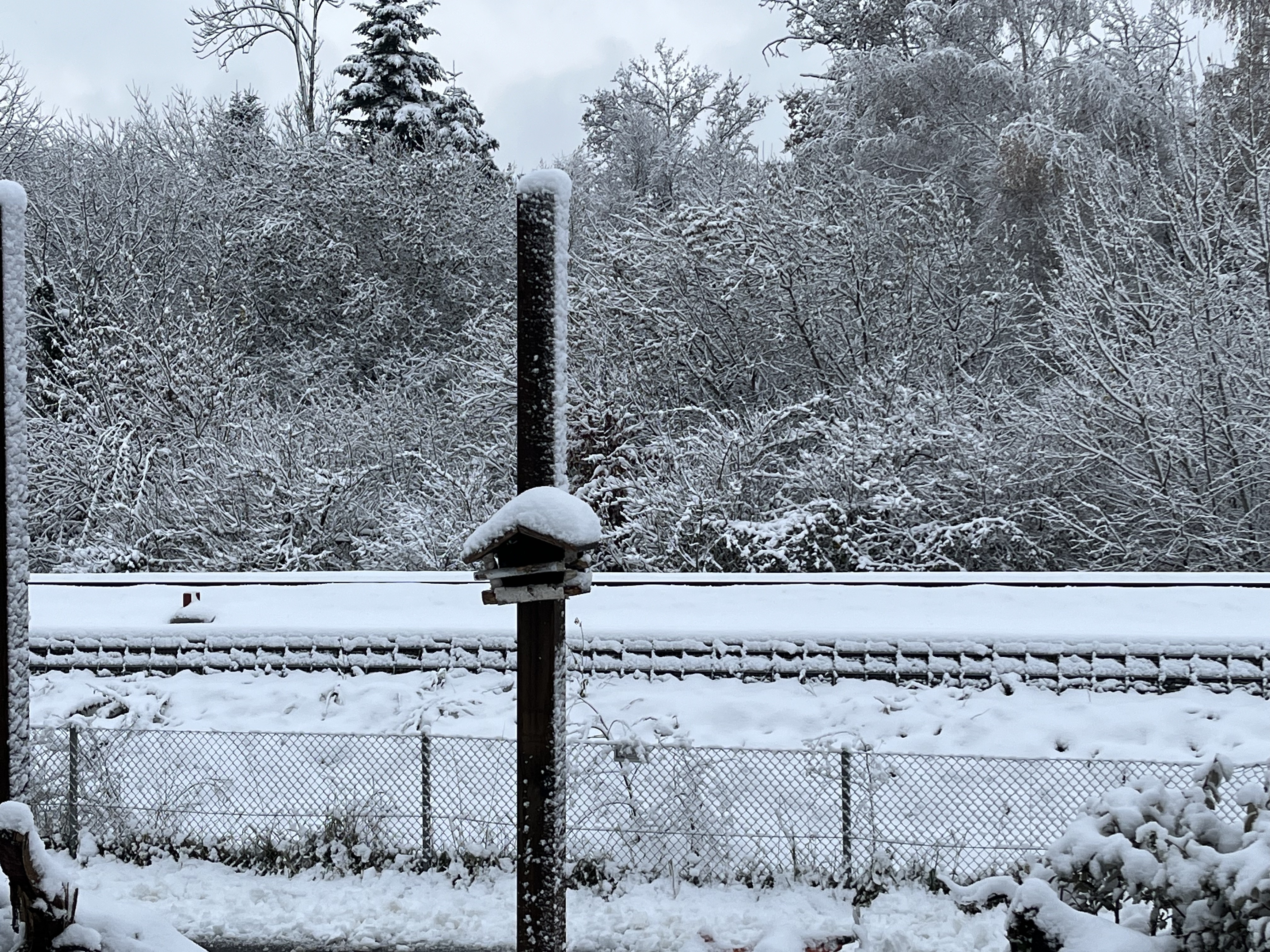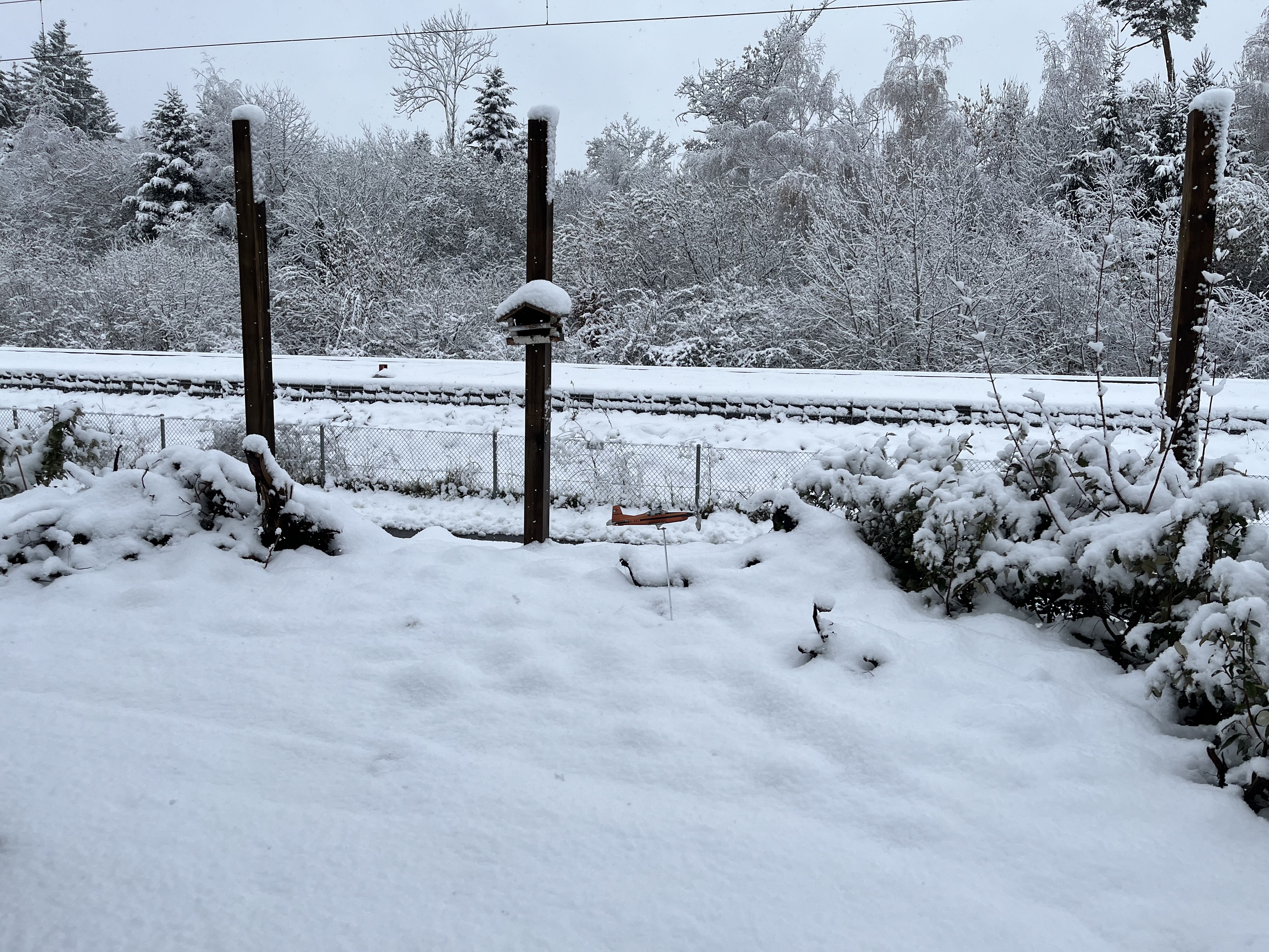 Les jardiniers reviennent vers la fin de l’automne et taillent quasiment toutes les plantes à raz-le-sol. Une première coupe importante pour assurer une bonne repousse l’année prochaine. Les jardiniers enfouissent également les bulbes des jonquilles, tulipes et crocus qui sortiront dès les premiers rayons printaniers. Nous décrochons les voiles qui nous protégeaient du soleil et nous utilisons un des poteaux en bois pour suspendre la mangeoire des oiseaux. Bien nous en prend, car les premières neiges de fin novembre surprennent notre petit jardin qui se retrouve soudain sous une jolie couche blanche. Les oiseaux se réjouissent de trouver des graines de tournesol au sec.