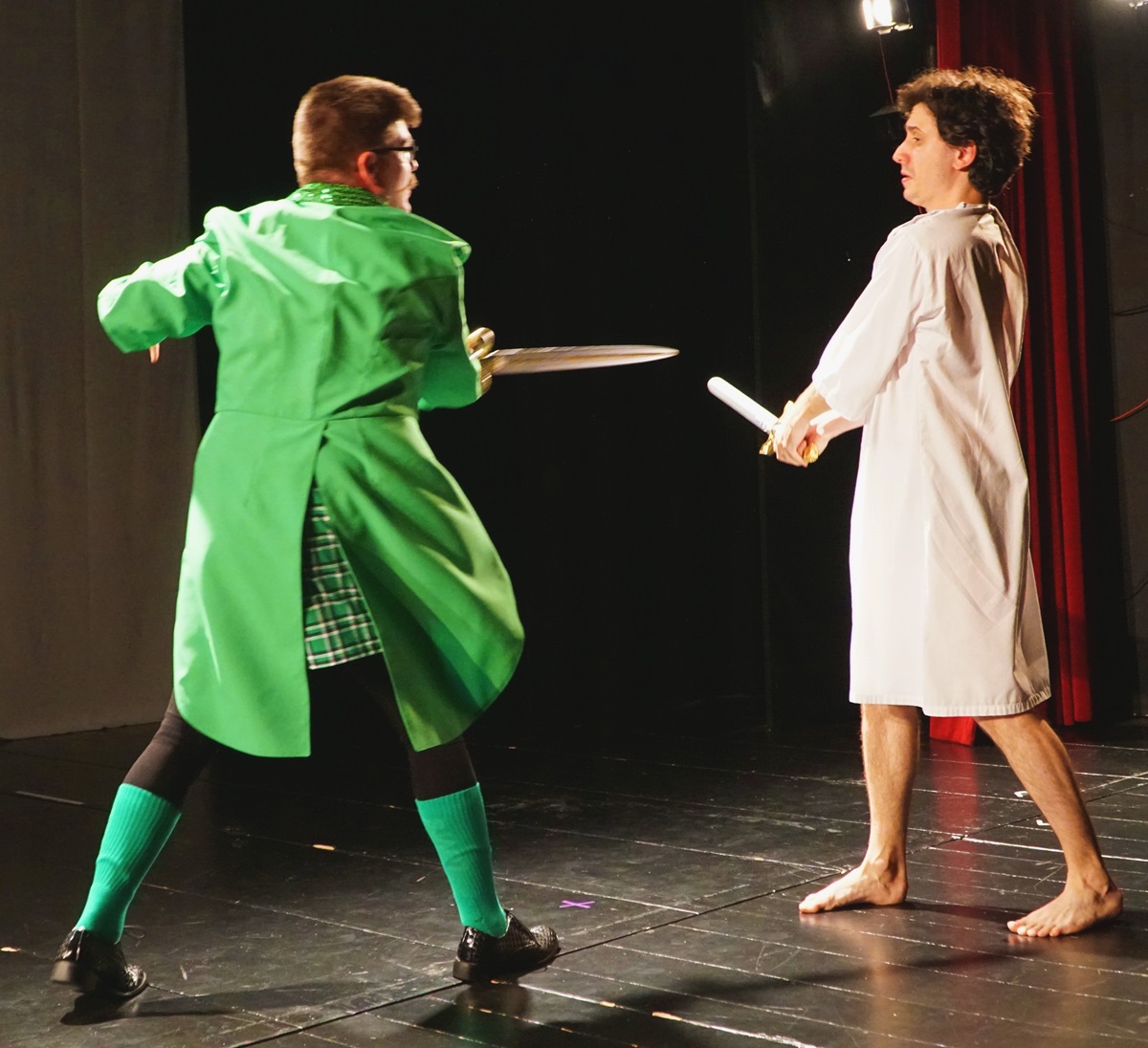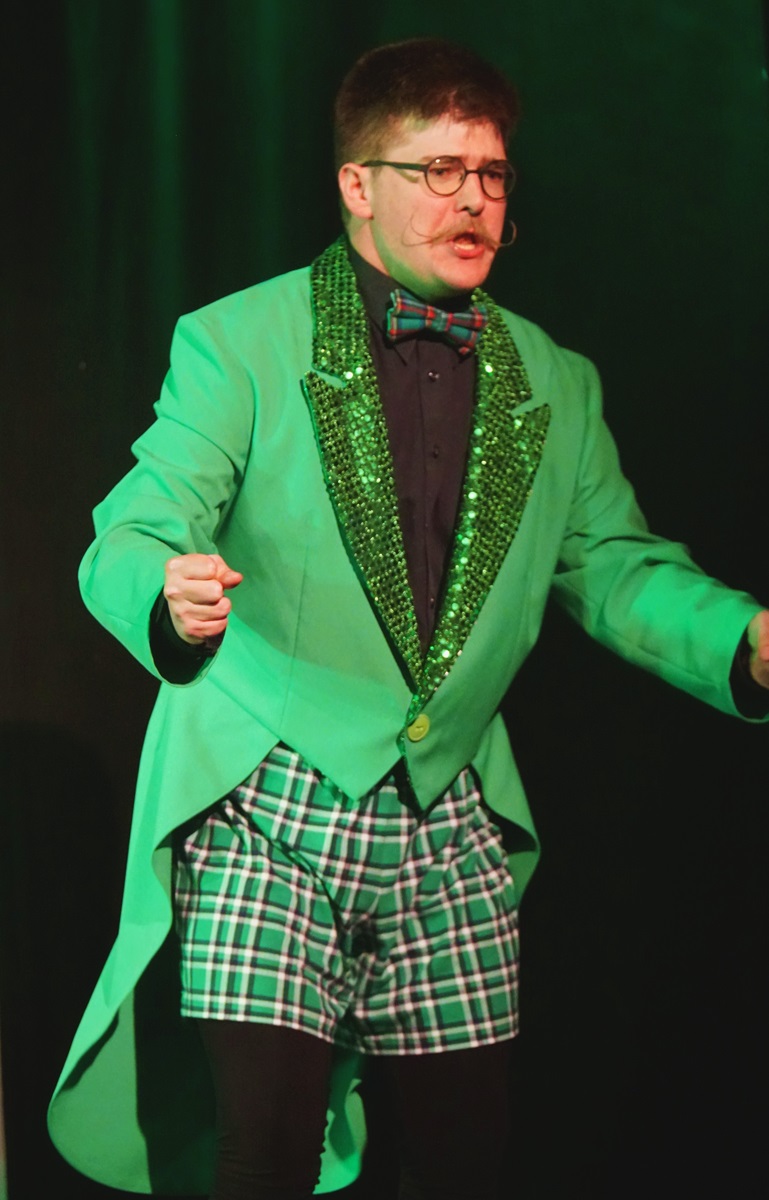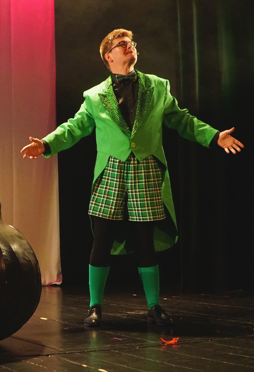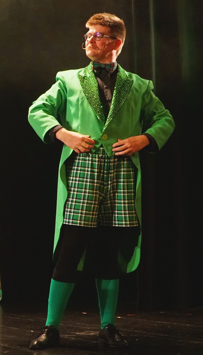 Dans les hallucinations de Gordon, son employeur Mr Bungee – pour lequel il doit composer des comptines d’enfant – lui apparait sous la forme d’une grenouille. Pour le costume de cette grenouille, la metteuse en scène me demande une queue-de-pie verte et des shorts écossais trop courts… Je suis responsable des costumes de cette comédie musicale… et je comprends vite qu’il va falloir coudre cet ensemble. Un joli défi de couturière 🙂