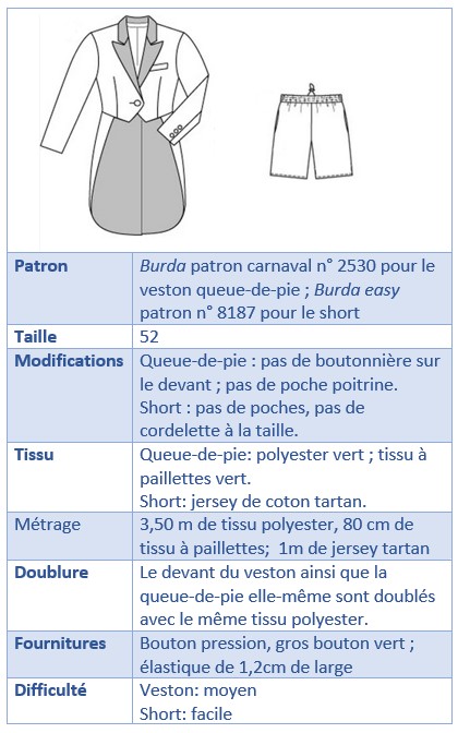 Je suis étonnée de constater que la réalisation d’une queue-de-pie n’est pas si compliquée! Le col demande un peu de concentration, surtout au moment de le retourner. Les pics doivent être précis. Pour le reste, le modèle ne présente pas vraiment de difficultés. Il faut dire toutefois que le costume ne comporte pas de manches veston (pas de boutonnières). En parlant de boutonnière, par manque de temps je décide de renoncer à en réaliser une sur le devant. Le veston se ferme sur un gros bouton pression et je décore le devant d’un gros bouton vert.