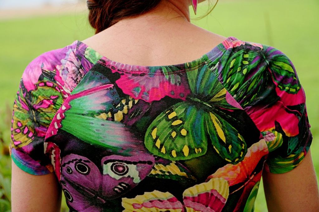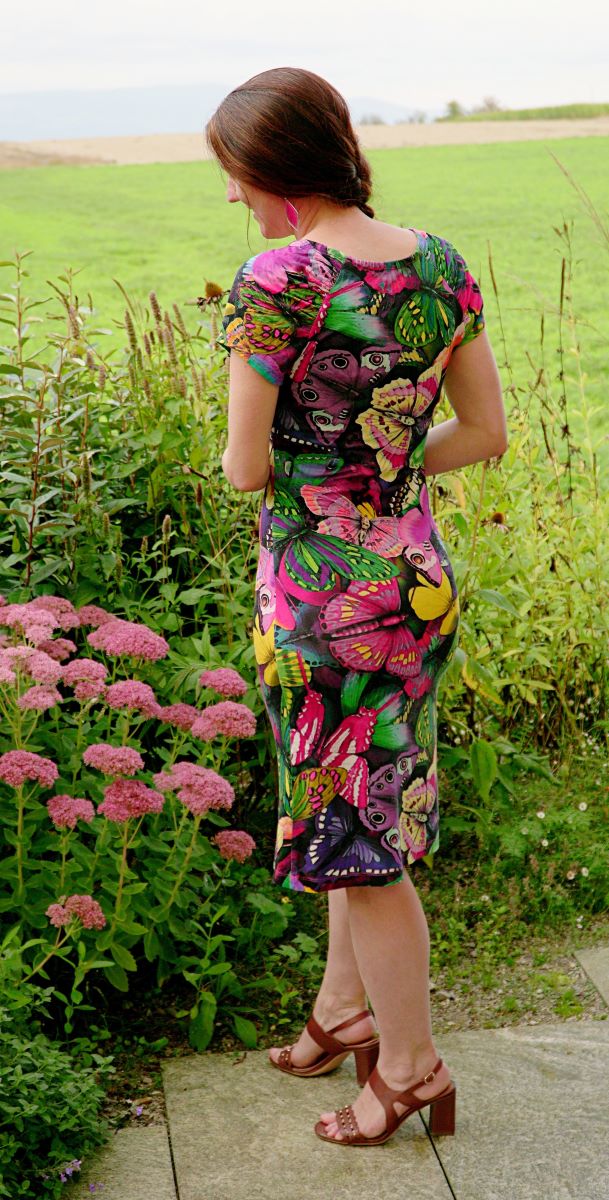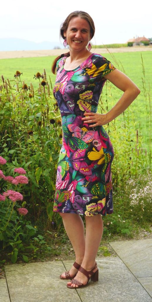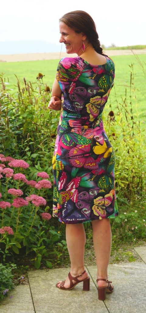 Mes projets de théâtre m’ont tenue en otage tous ces mois passés, si bien que les projets de couture ont dû virer bon gré mal gré au second plan. J’ai toutefois réussi à achever quelques beaux projets, dont fait partie cette jolie robe en jersey au motif papillons. Il était temps de la photographier avant que l’automne ne s’empare définitivement de mon jardin.
