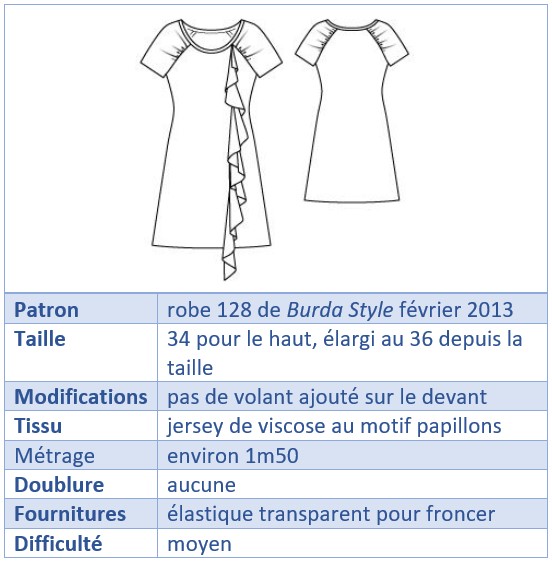 Le coupon relativement petit de ce jersey coloré – environ 1m50 – ne me permettait pas de faire des folies en termes de patronage. J’ai donc trouvé dans un de mes magazines un patron de robe toute simple avec des manches courtes présentant un joli fronçage. Il s’agit de la robe 128 du magazine Burda Style de février 2013. Mais je décide de la coudre sans le long volant que le modèle original présente sur le devant.